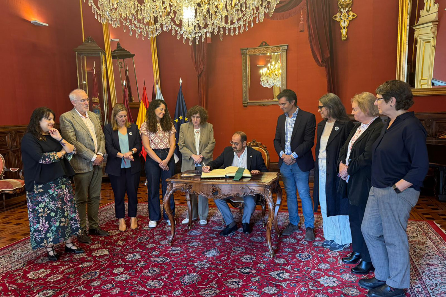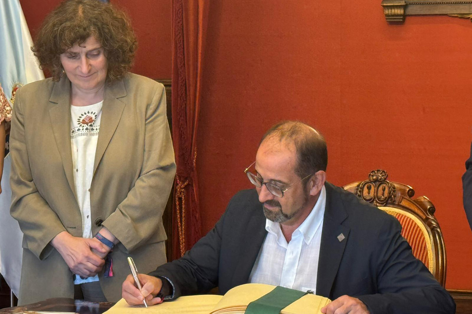 O presidente da RAG asinando no Libro de Honra do Concello xunto á alcaldesa Goretti Sanmartín.