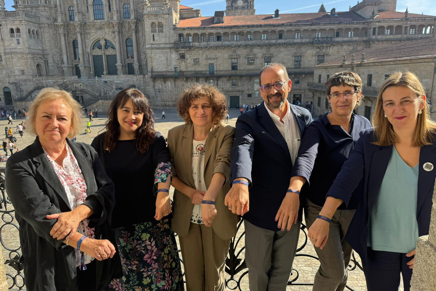 Dolores Sánchez Palomino, María López-Sández, Goretti Sanmartín, Henrique Monteagudo, Ana Boullón e Míriam Louzao posan no balcón do pazo de Raxoi coas pulseiras da campaña municipal "Ficha polo galego".