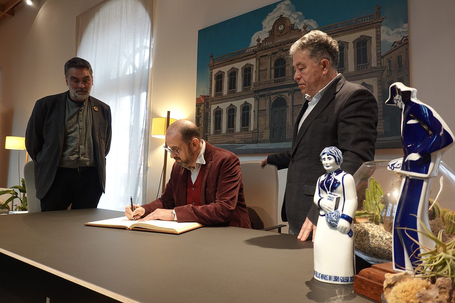 Henrique Monteagudo asina no libro de honra do Concello de Pontevedra.