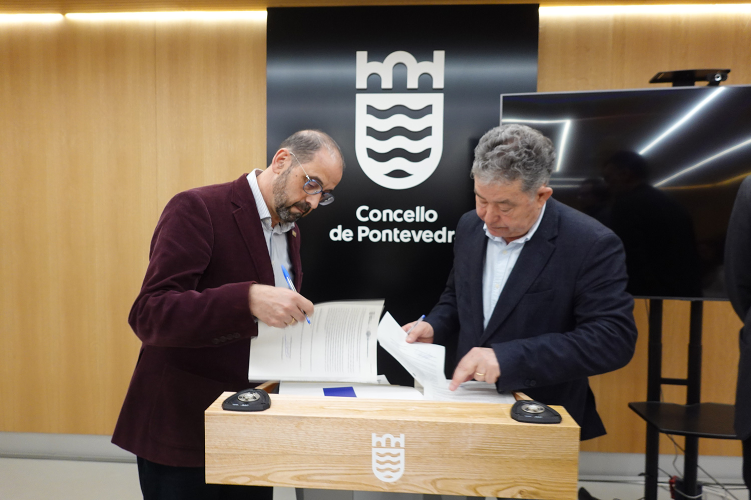 Henrique Monteagudo e Miguel Anxo Fernández Lores asinando o acordo.