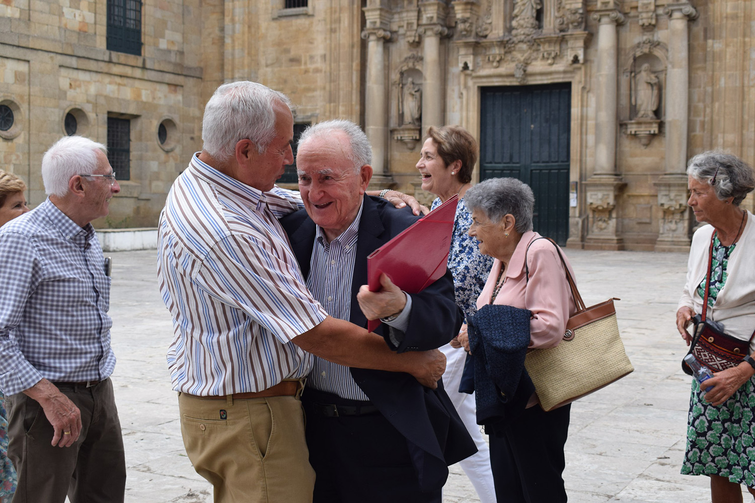 Don Xesús saúda a exalumnos na praza de Lourenzá, pouco antes da súa intervención no Simposio Francisco Fernández del Riego (ARAG)