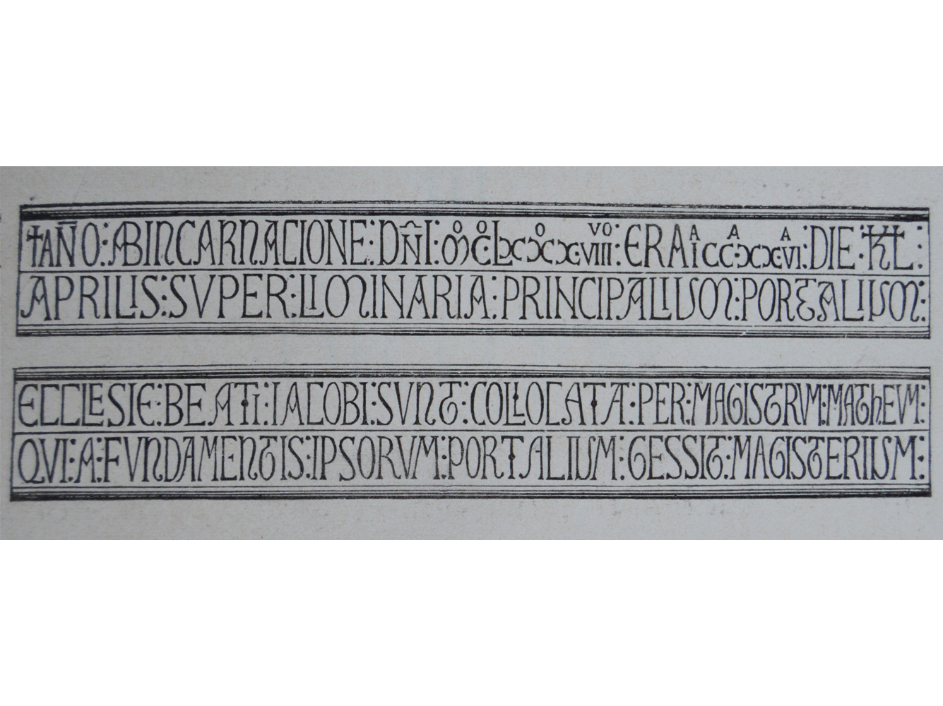A imaxe mostra unha reprodución das epígrafes do linteis do Pórtico da Gloria feita polo xoieiro e gravador E. Mayer para o libro El Pórtico de la Gloria: estudio sobre este célebre monumento de la basilica compostelana (1893), de Antonio López Ferreiro, unha obra que Castelao tiña na súa biblioteca particular.