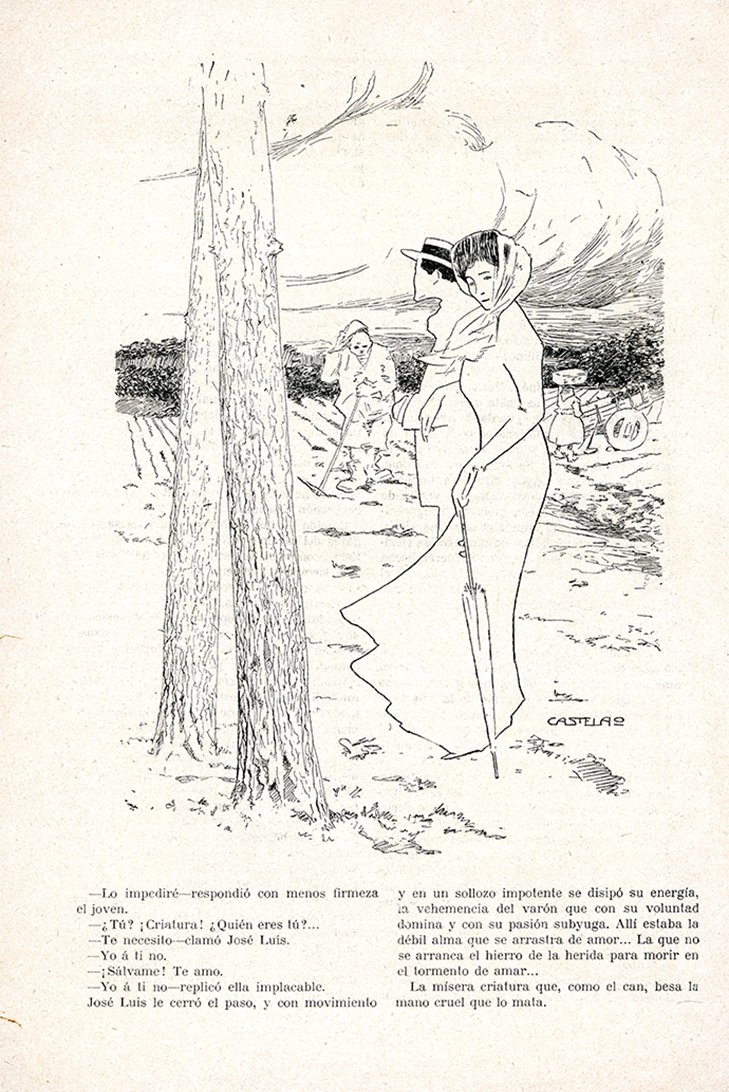 Castelao limitouse a ilustrar un folletín construído sobre a trama dun triangulo amoroso entre aristócratas, escrito pola aristócrata Sofía Casanova, e destinado a un público que, se non pertencía á aristocracia, devecía por formar parte dela.