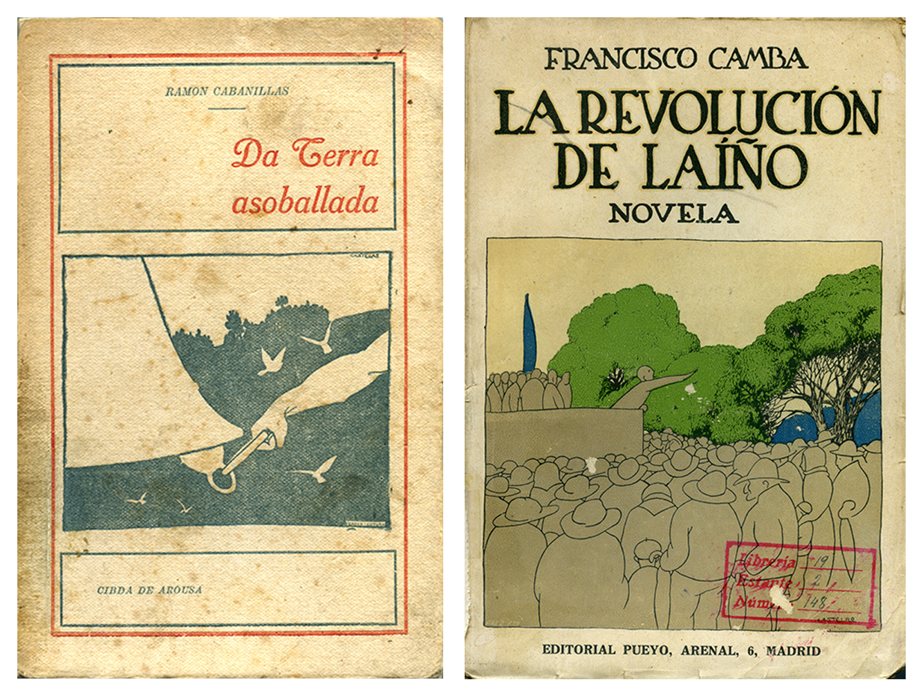 Esquerda: Da terra asoballada / Ramón Cabanillas. Cibdá de Arousa: [Galicia Nueva], 1917. Dereita: La Revolución de Laíño. Novela / Francisco Camba. Madrid: Pueyo, 1919. Fonte: Real Academia Galega. Hemeroteca