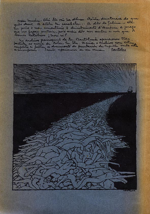 En contraposición coa maioría das manifestacións artísticas arredor da figura de Cristovo Colón, a proposta de Castelao para esta contracuberta non repara na suposta gloria e heroicidade que supuxo a chegada de Colón e da súa tripulación a unha illa do Caribe. O rianxeiro centrouse en reflectir o drama da emigración galega cara ao continente americano ao longo de séculos, mediante a representación dunha interminable ringleira de corpos sen vida que conforman o ronsel deixado por unha carabela que se albisca no horizonte, e que tanto nos lembra a imaxes do presente.