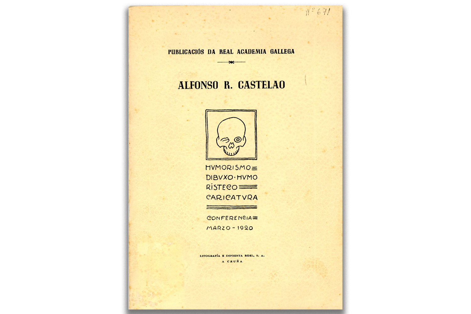 O 2 de marzo de 1920 inaugurábase na Coruña a exposición dos debuxos realizados entre 1916 e 1918 que máis tarde se integrarían no álbum Nós. Como complemento da exposición, Castelao impartiu días despois unha conferencia artellada en tres partes: a primeira, sobre humorismo, incluía o relato “Memorias d’un esquelete” que despois aparecerá en Un ollo de vidro; a segunda e a terceira, sobre debuxo humorístico e caricatura, eran unha ampliación de Algo acerca de la caricatura.