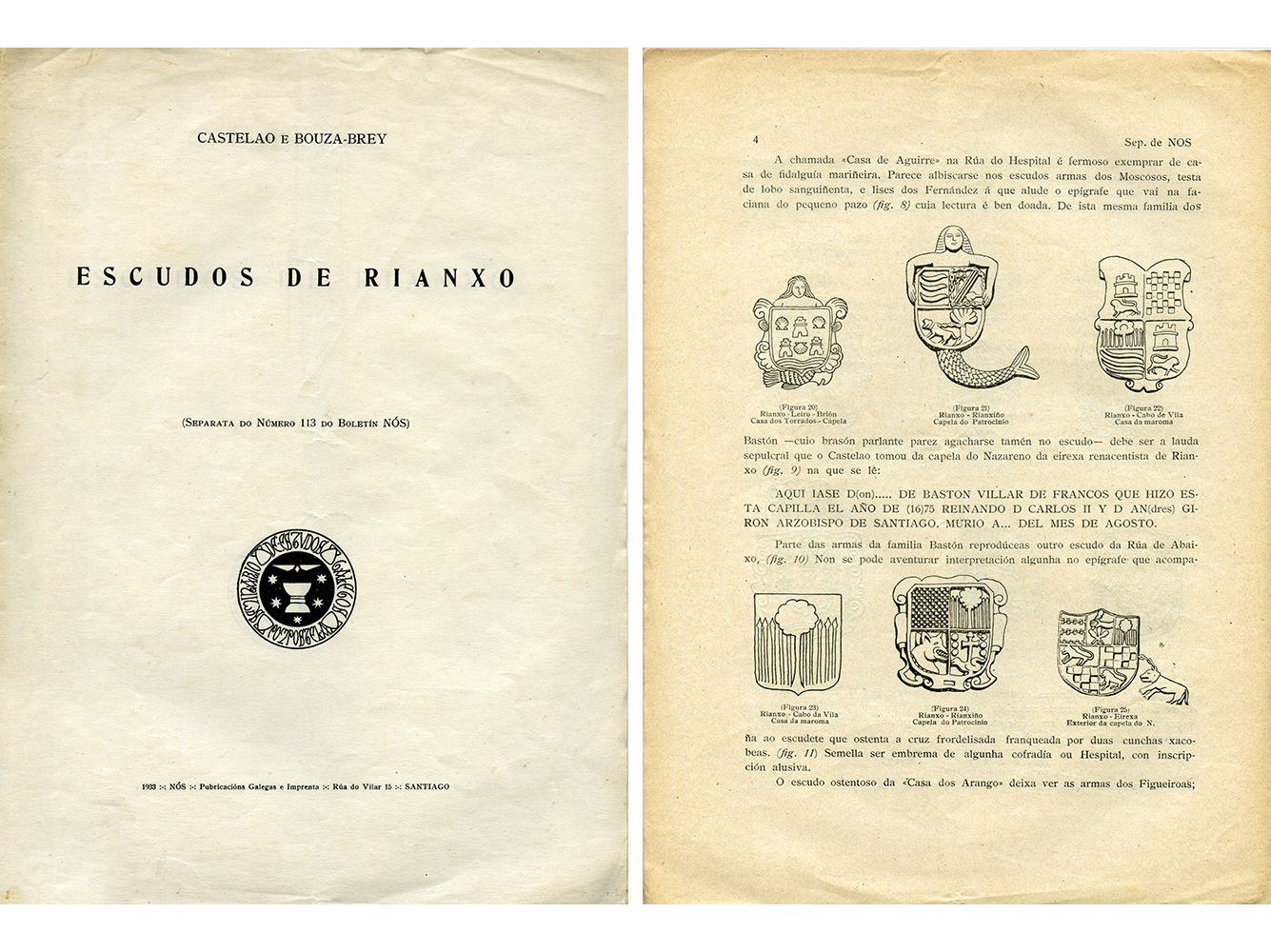 Esta separata do artigo “Escudos de Rianxo” que se publicou na revista Nós en 1933 contén debuxos de Castelao copiados da heráldica que el puido observar na súa vila natal. Os debuxos van acompañados dun texto de Fermín Bouza-Brey onde se identifican as familias que están representadas nos escudos. De especial interese é a heráldica dos Mariño na que aparece unha serea termando do escudo familiar, pois esa imaxe servirá de inspiración a Castelao cando no ano 1937 deseñe o escudo para a nova Galicia que debería rexurdir despois do negro período bélico.