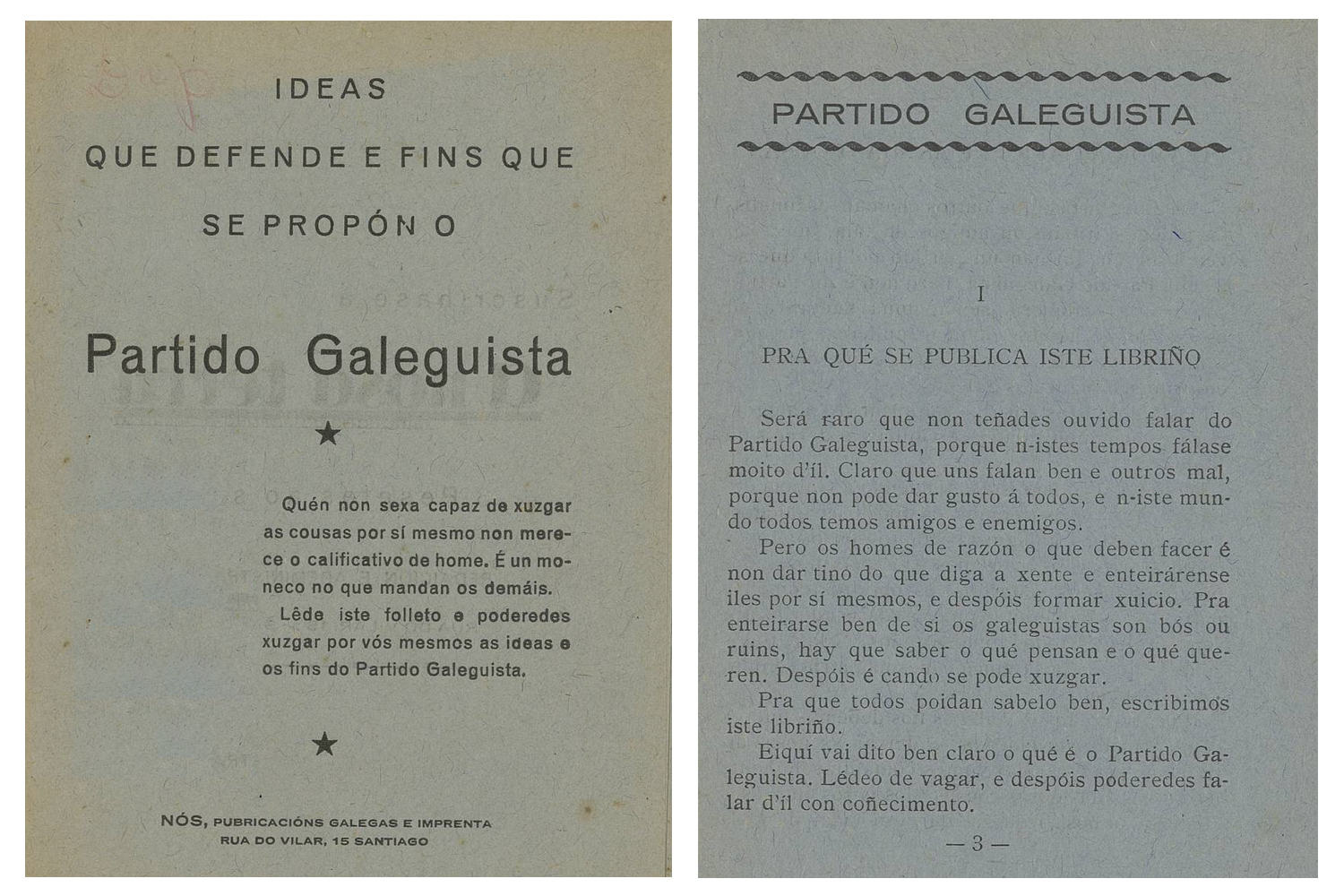 En outubro de 1933 disolvéronse as Cortes da República española e convocáronse novas eleccións para o 19 de novembro. Neste contexto electoral, apareceu publicado pola editorial Nós o folleto anónimo Ideas que defende e fins que se propón o Partido Galeguista. Este libriño de 32 páxinas divulgaba o ideario político do Partido e daba a coñecer as súas propostas para o país. Aínda que ás veces se atribuíu a Vicente Risco, o manuscrito orixinal do texto está redactado por Castelao e constitúe unha das primeiras achegas dos seus escritos políticos.