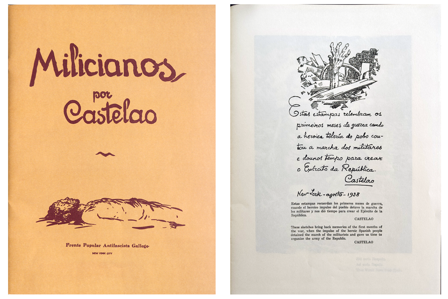 Con Milicianos complétase a súa triloxía de álbums da guerra. Está composto por once imaxes nas que se fai unha gabanza da resistencia e da valentía dos soldados republicanos. Cada imaxe leva ademais un texto moi breve en galego, castelán e inglés. Aínda que elaborado en Valencia en 1937, o álbum foi publicado o ano seguinte en Nova York pola Fronte Popular Antifascista Galega. A súa aparición tivo lugar durante a estadía de Castelao nos Estados Unidos en viaxe de propaganda para axudar ao esforzo bélico da República.