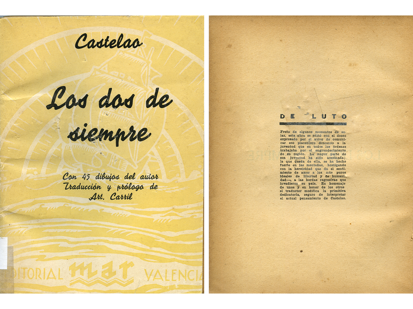 No ano 1937 viu a luz en Montevideo esta tradución para o castelán de Os dous de sempre que se publicou sen o coñecemento do autor. Foi o seu tradutor Arturo Carril Amigo, natural de Corcubión, quen ademais engadiu un limiar no que gababa a figura de Castelao. Emigrado a Montevideo sendo moi novo, Carril traballou como linotopista e frecuentou os círculos galeguistas e anarquistas da cidade. Alí tamén fundou a Editorial Mar onde apareceu este libro, que el dedicou a toda a mocidade galega que daquela estaba a defender a República das “hordas regresivas” levantadas contra ela.
