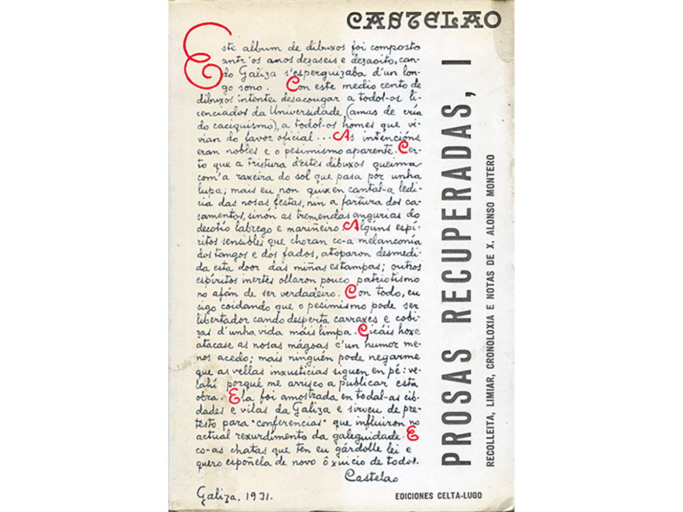 Xesús Alonso Montero publicou en 1974 na editorial Celta esta escolma que contiña textos pouco coñecidos de Castelao. O libro xuntaba escritos aparecidos na prensa, fragmentos de entrevistas e de discursos, extractos de conferencias e incluso algunha anécdota sobre o rianxeiro contada por persoas que o coñeceron. Na opinión do editor, con estas Prosas recuperadas ofrecíase unha imaxe máis completa de Castelao como escritor e como home, na que se mostraban os seus primeiros pasos literarios e algúns “retrincos do seu existir”.