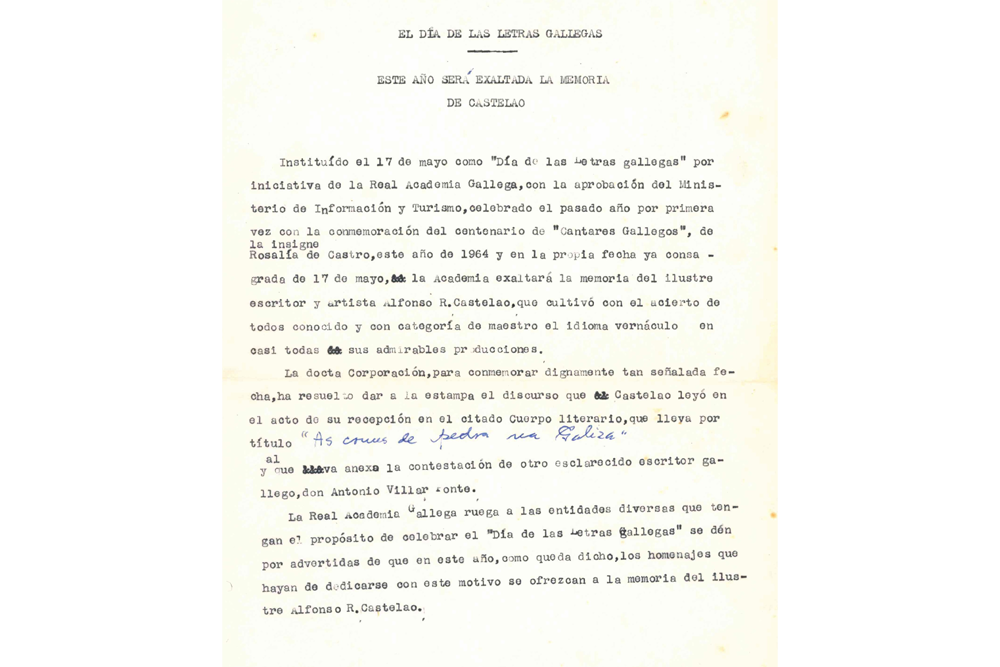 Fonte: Comunicado da Real Academia Galega enviado á prensa para anunciar a celebración do Día das Letras Galegas consagrado a Castelao. Real Academia Galega. Arquivo