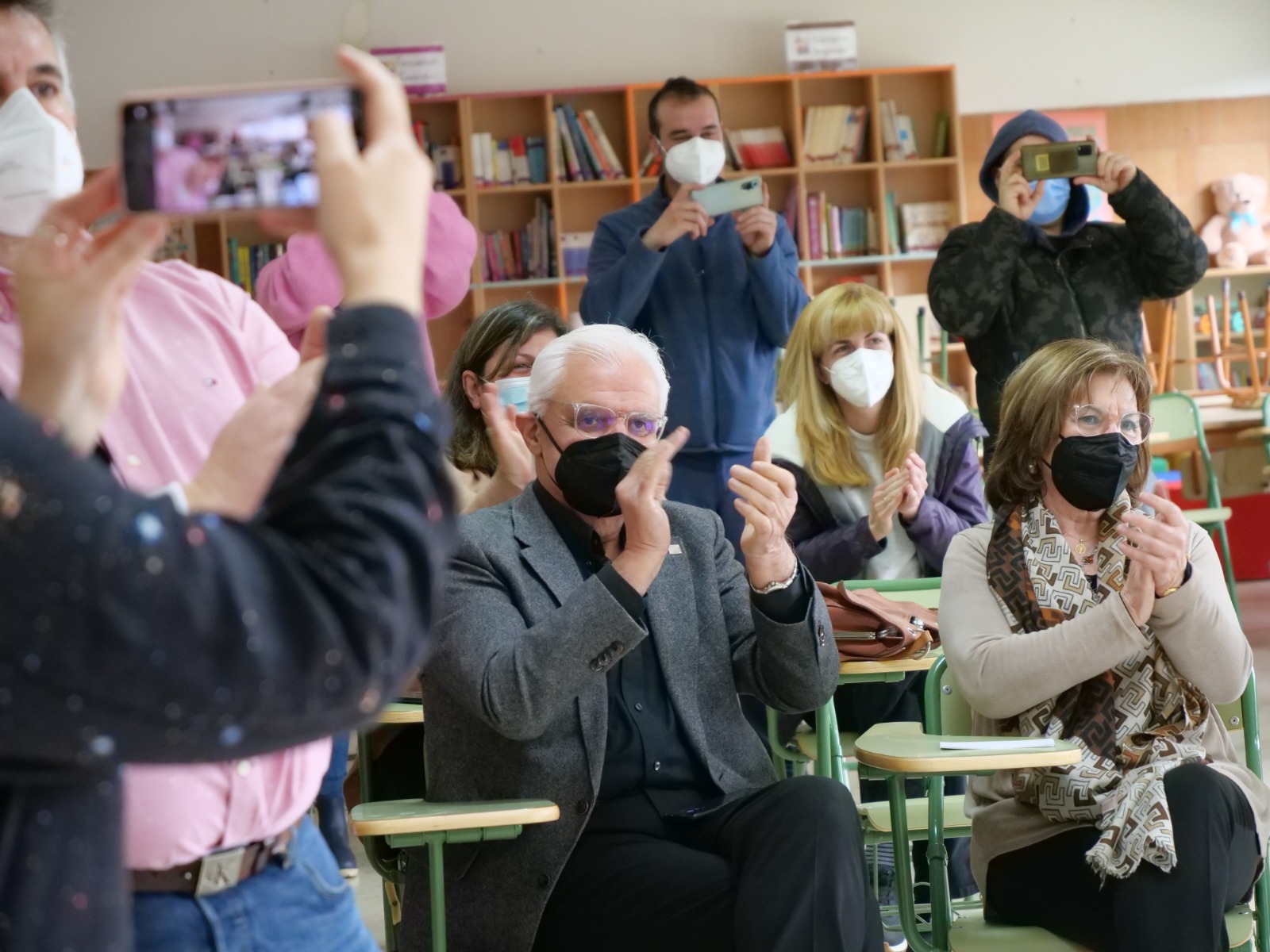 O presidente da RAG, Víctor F. Freixanes, e Fina Casalderrey aplauden a actuación do alumnado