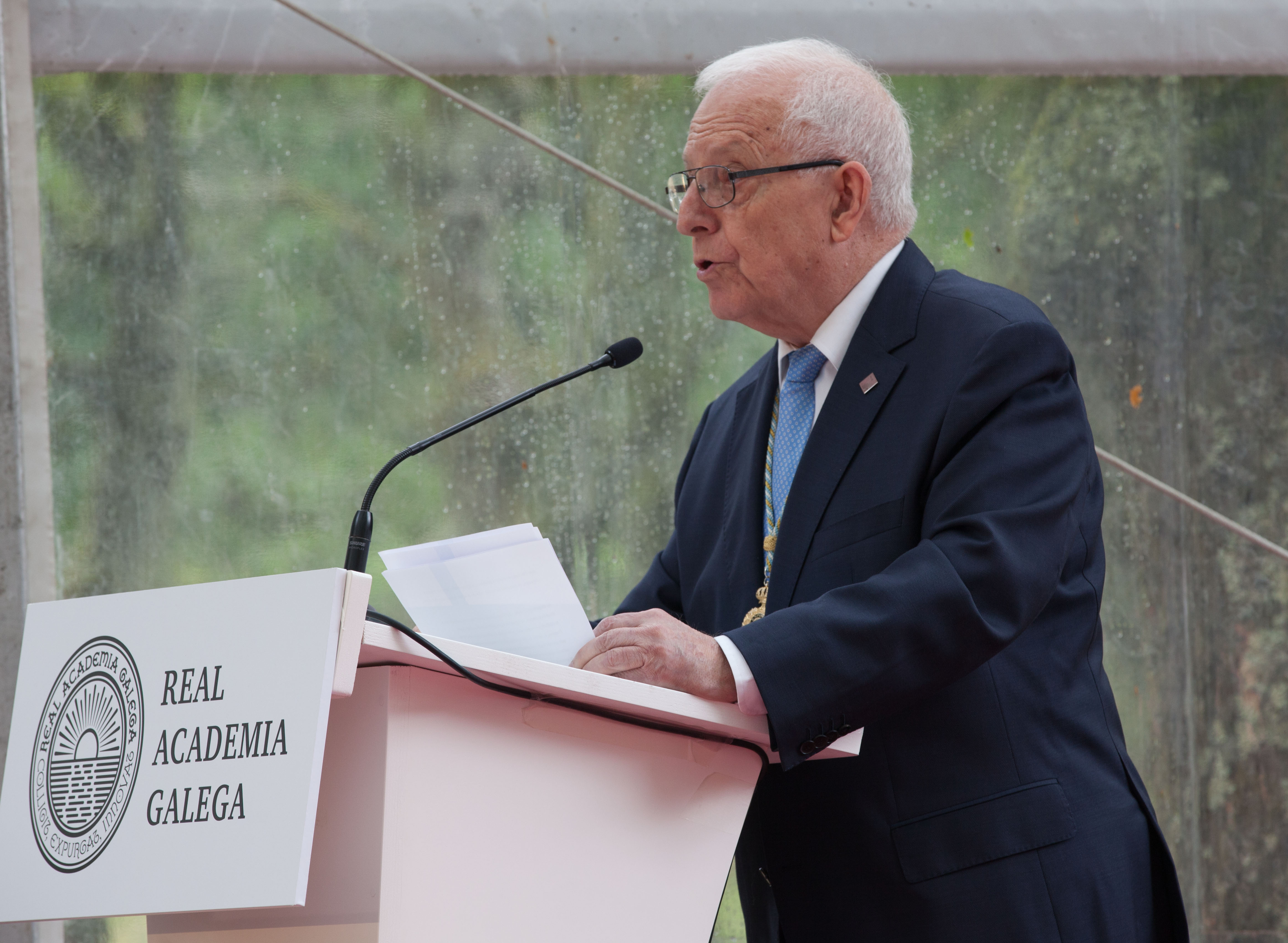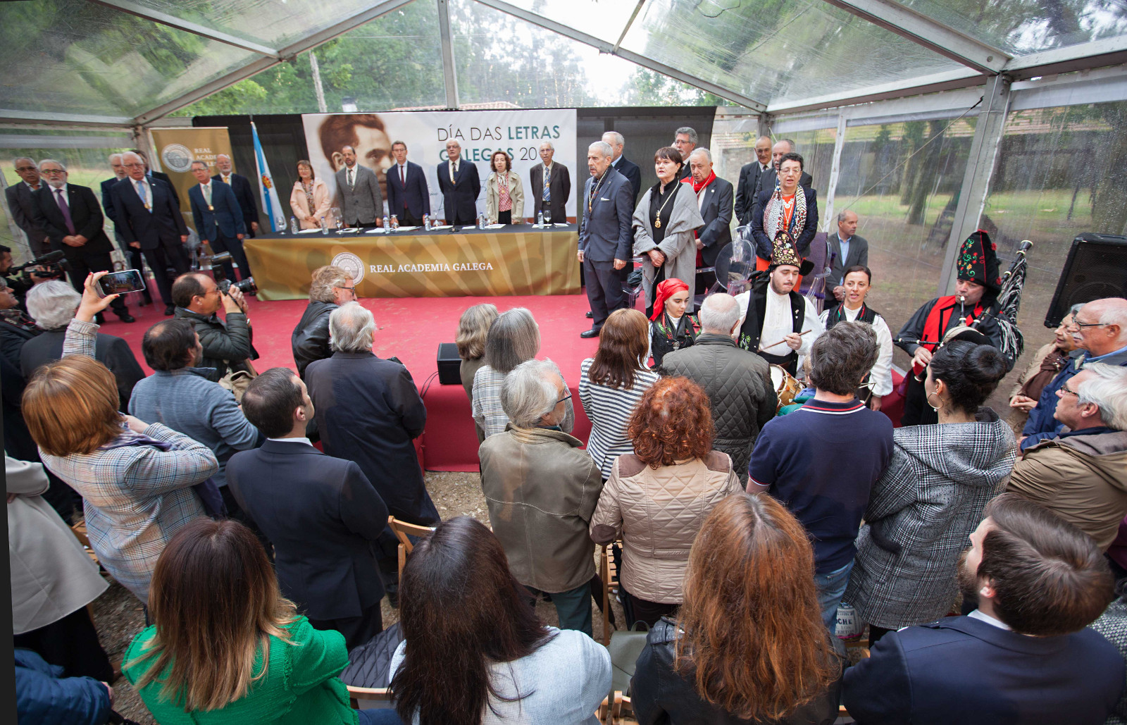 En primeira fila, pola esquerda, Miguel Santalices, presidente do Parlamento de Galicia; Jorge Cubela López, alcalde de Cerdedo-Cotobade; Román Rodríguez, conselleiro de Cultura; e Carmen Pomar, conselleira de Educación da Xunta de Galicia.
