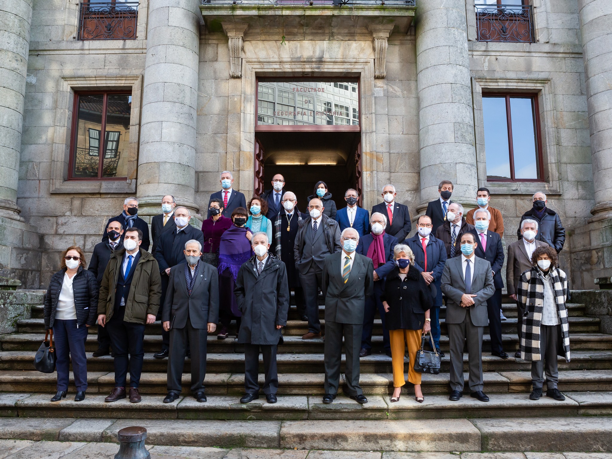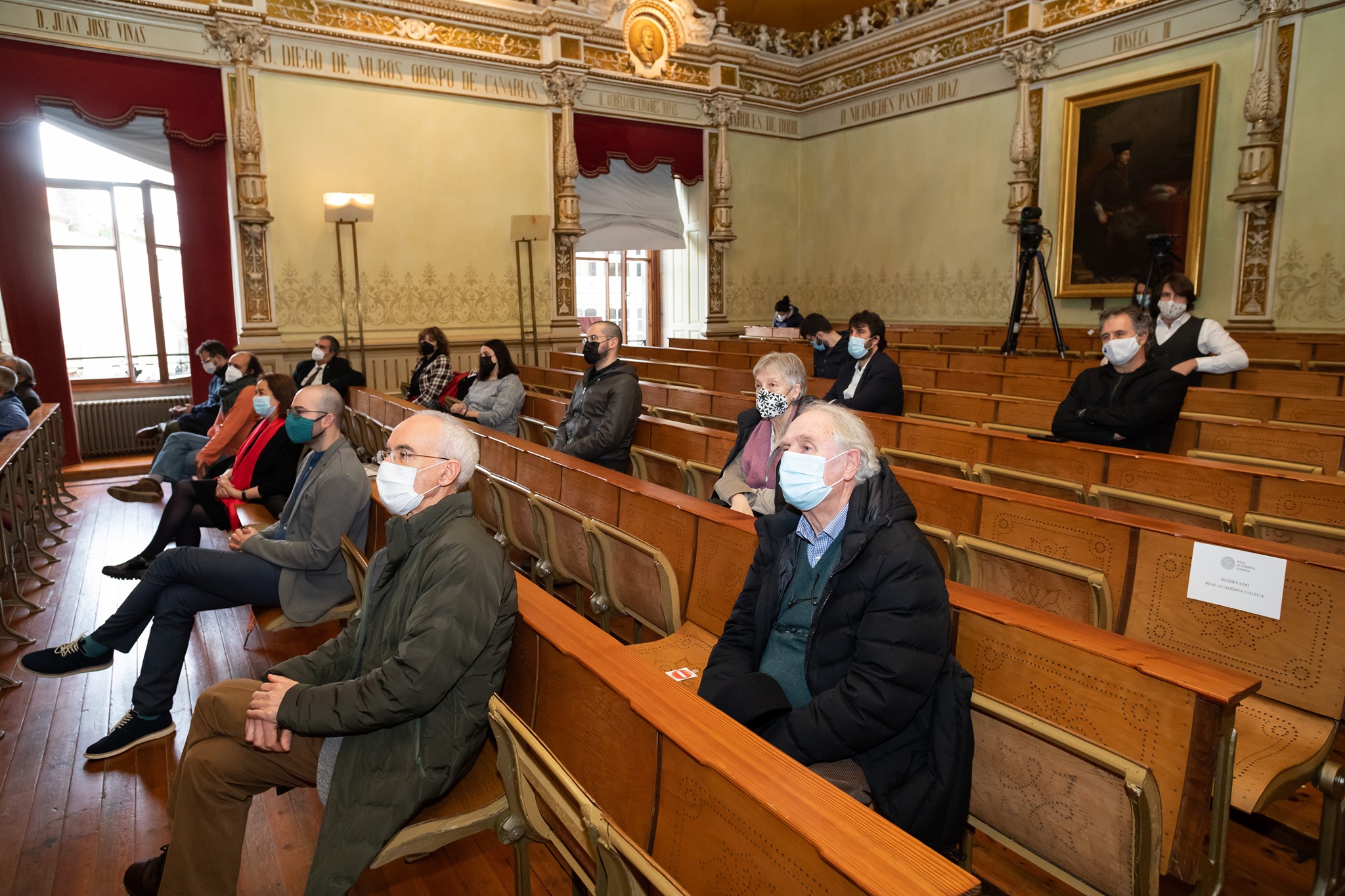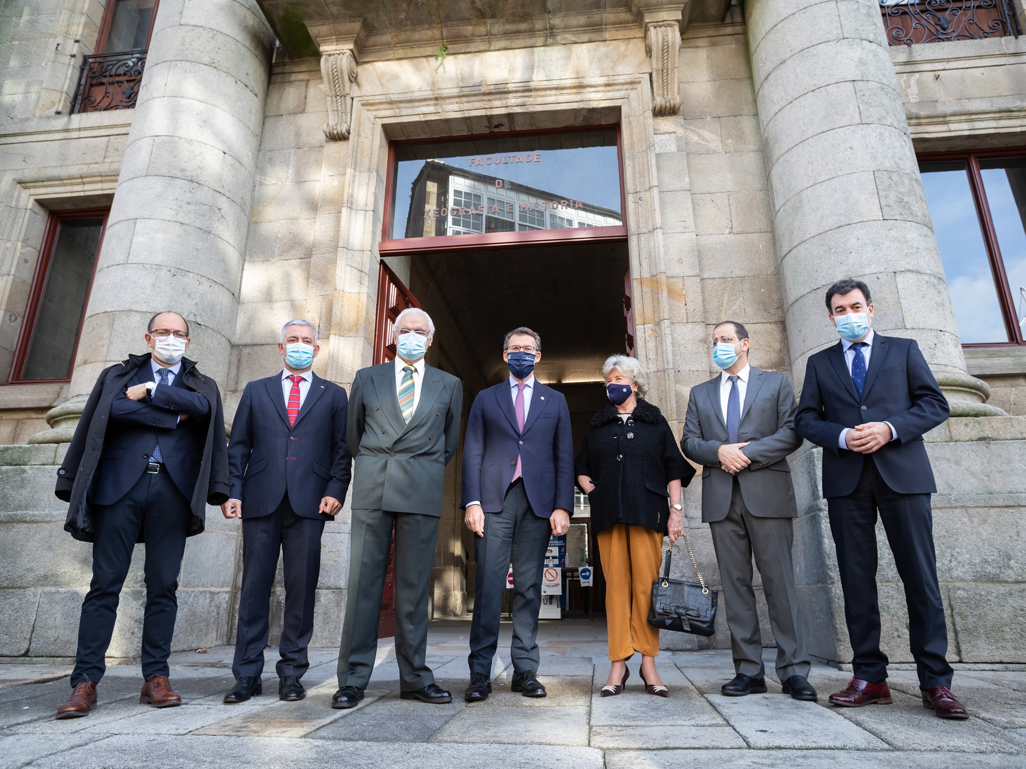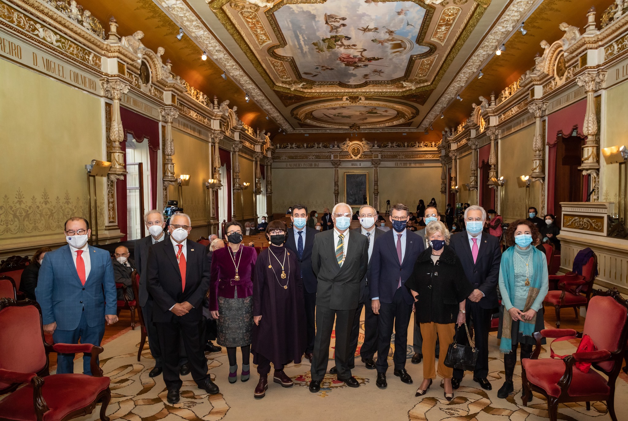 Os membros da executiva da Academia e os académicos encargados de profundar na vida e na obra de Carvalho Calero, acompañados de María Victoria Carballo Calero, filla do homenaxeado, e do presidente da Xunta de Galicia, o presidente do Parlamento de Galicia, a presidenta do Consello da Cultura Galega e o reitor da USC.