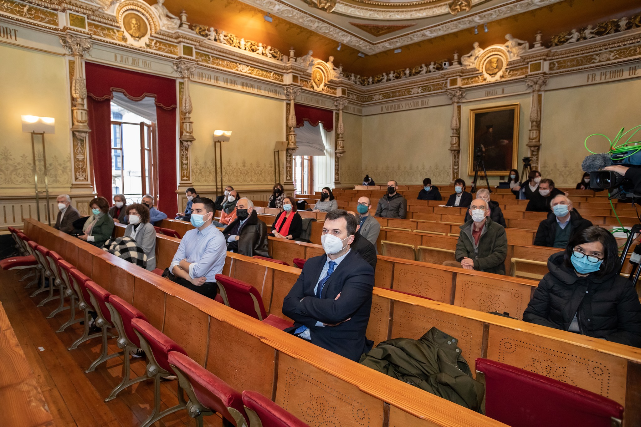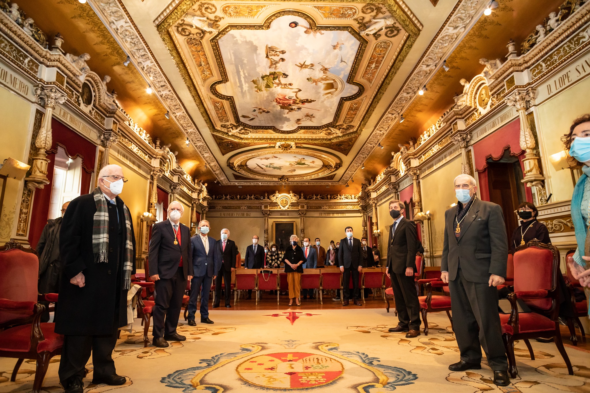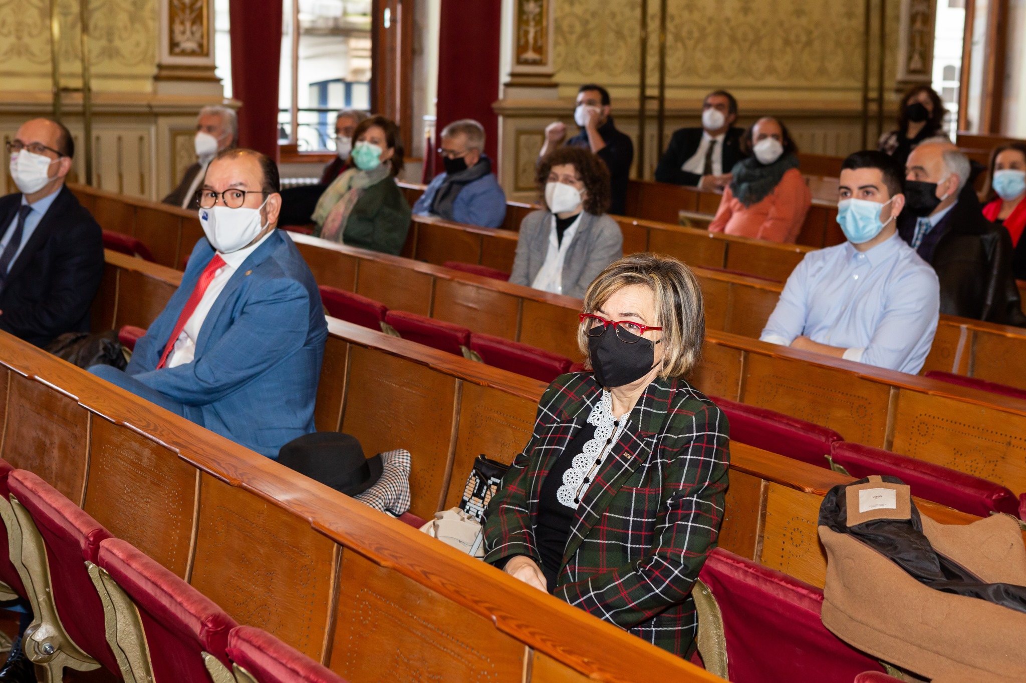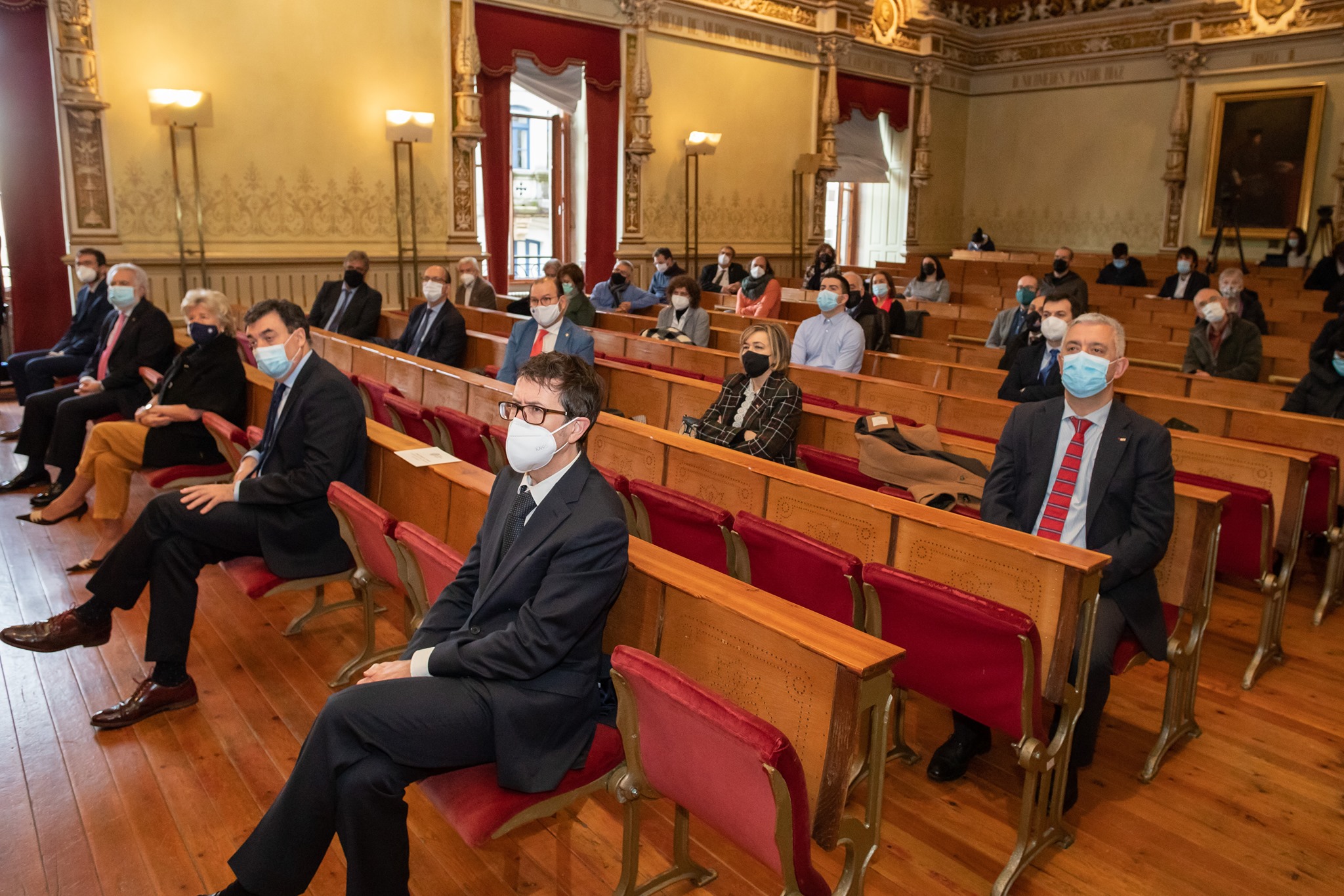 Os membros da executiva da Academia e os académicos encargados de profundar na vida e na obra de Carvalho Calero, acompañados de María Victoria Carballo Calero, filla do homenaxeado, e do presidente da Xunta de Galicia, o presidente do Parlamento de Galicia, a presidenta do Consello da Cultura Galega e o reitor da USC.