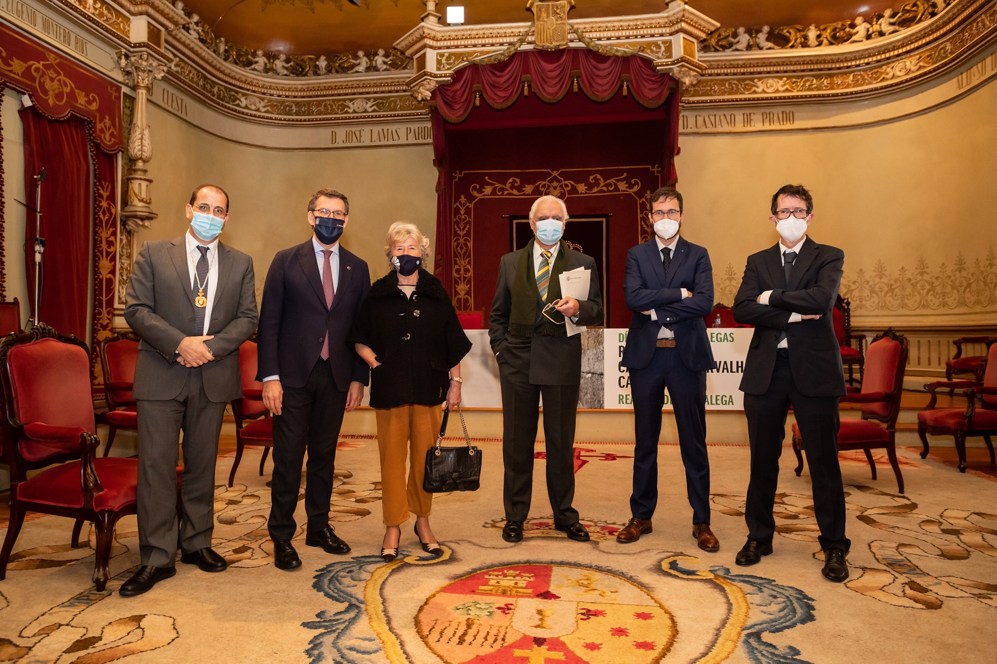 O presidente da RAG, Víctor F. Freixanes; o presidente da Xunta de Galicia, Alberto Núñez Feijóo; e María Victoria Carballo-Calero Ramos, filla do homenaxeado, posan xunto ao secretario da RAG, Henrique Monteagudo; o conselleiro de Cultura, Román Rodríguez; o secretario xeral de Cultura, Anxo M. Lorenzo Suárez; e o secretario xeral de Política Lingüística, Valentín García.