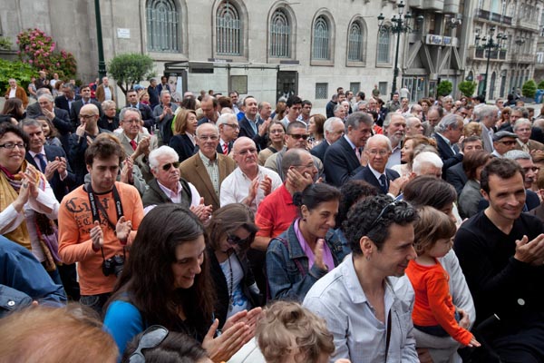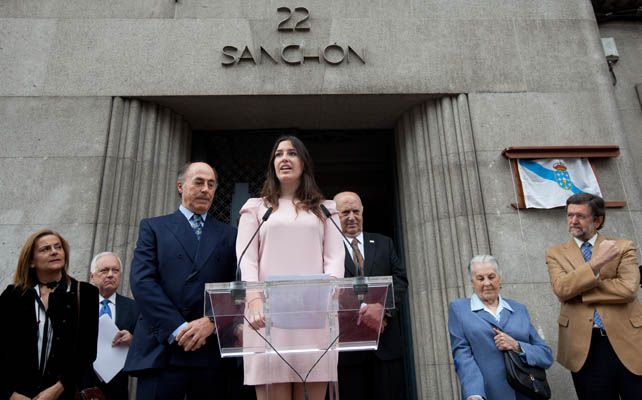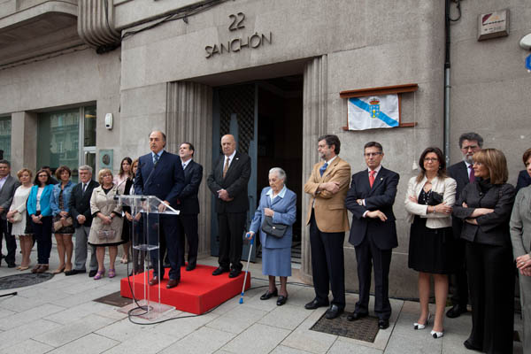 A viúva do homenaxeado, Dona Pilar, descubrindo a placa conmemorativa en presenza do presidente da Academia, Méndez Ferrín, Alfonso Paz Andrade, o alcalde de Vigo, Abel Cabellero e do deputado autonómico, Francisco Cerviño.