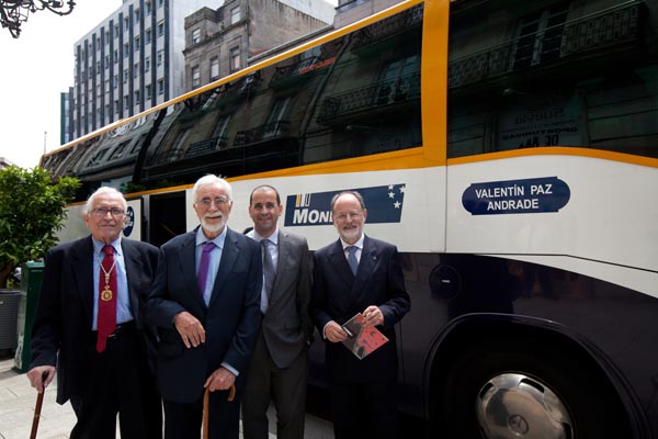 Os académicos de número Xosé Neira Vilas, Bernardino Graña Villar, Xosé Henrique Monteagudo Romero e Xesús Ferro Ruibal antes de subir ao autobús "Valentín Paz Andrade"