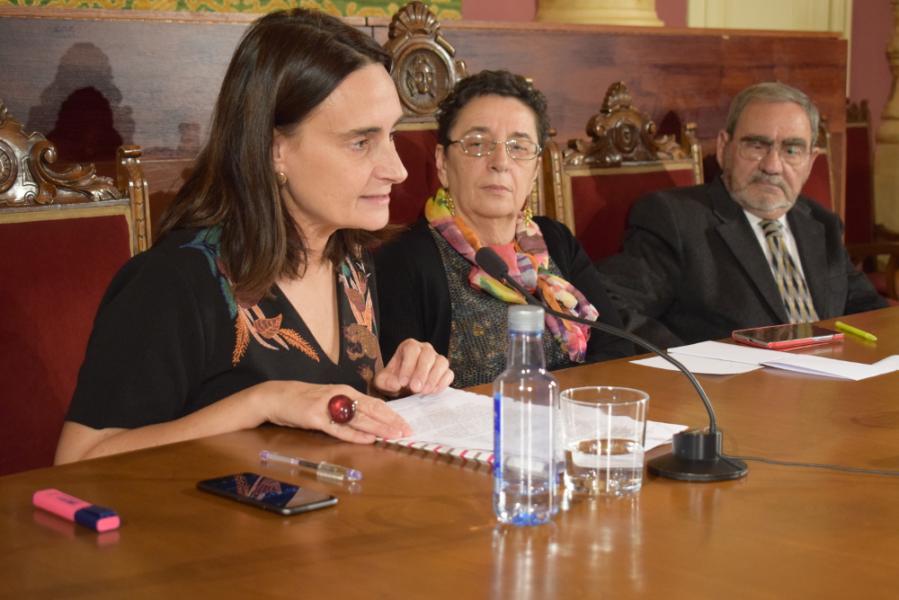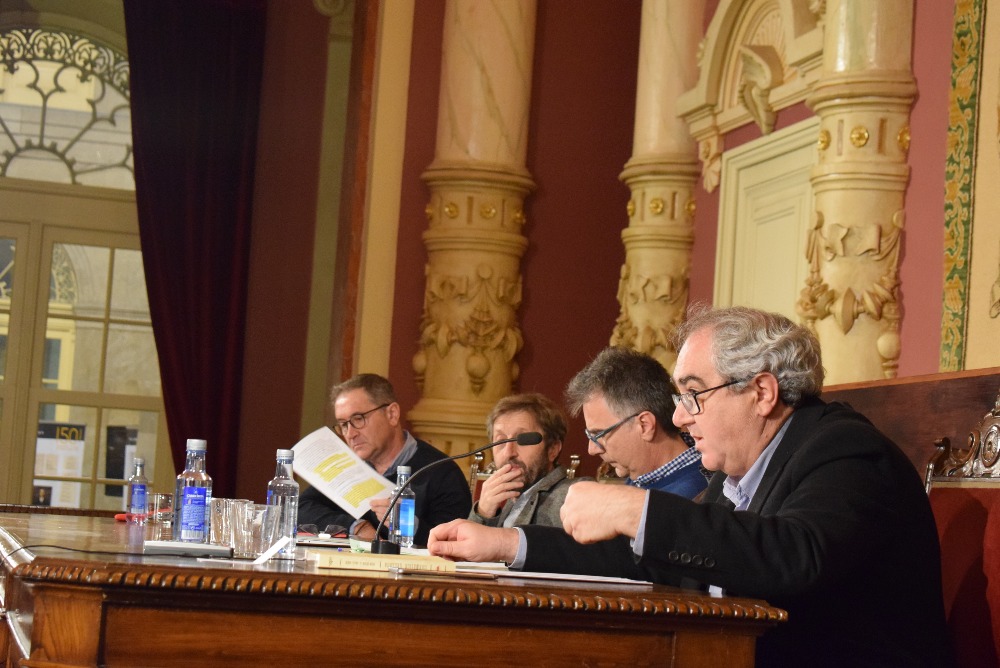 Pola esquerda, Teresa López, profesora da UDC, a académica Rosario Álvarez, coordinadora do Seminario de Gramática da RAG, o presidente Víctor F. Freixanes, Juan Luis Saco Cid e o académico Antón Santamarina na mesa de relatorios que abriu a homenaxe da RAG a Saco Arce no 150 aniversario da súa gramática