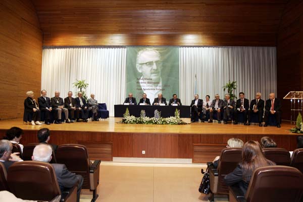 O presidente da RAG, Xosé Ramón Barreiro Fernández, o secretario, Manuel González González, o arquiveiro-bibliotecario, Xosé Luís Axeitos Agrelo e o vicesecretario Salvador García-Bodaño Zunzunegui, presidiron a Sesión plenaria extraordinaria e pública do Día das Letras Galegas, celebrada no auditorio do concello de Vigo.