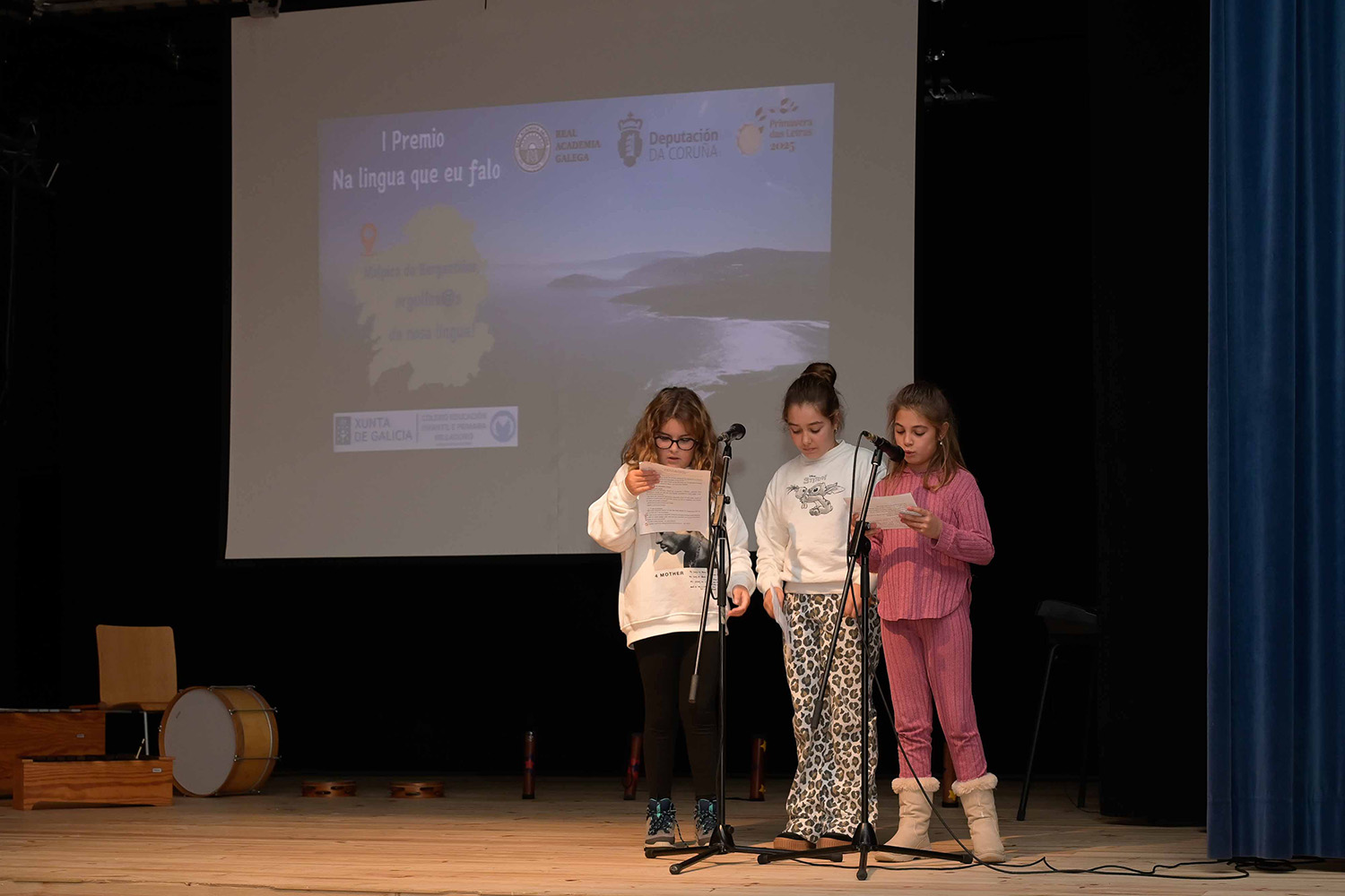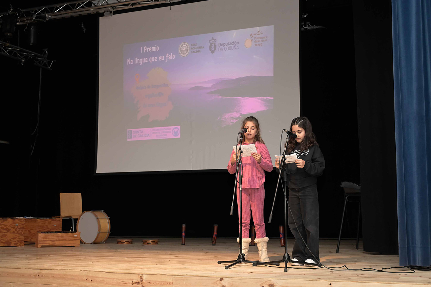Fina Casalderrey conduciu o acto, que acolleu o Centro Cívico de Malpica, canda o alumnado de 5º curso, que foi presentando unha escolma de experiencias do colexio para “coidar e empregar” o galego todo o ano. Cun guión inzado de palabras do seu Dicionario malpicán como atalora, campal, che, meu ou becheche, a achega dos nenos e nenas tivo o seu apoxeo coa interpretación, por parte da rapazada de 6º, da canción Galicia Elemental, creada en comunidade no marco do proxecto documental integrado NÓS: patrimonio in-MATERIAL!