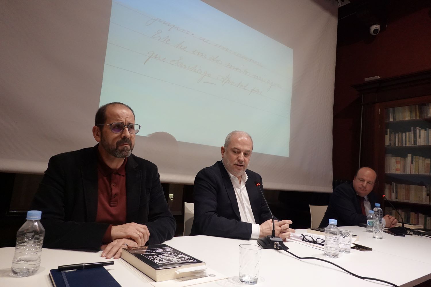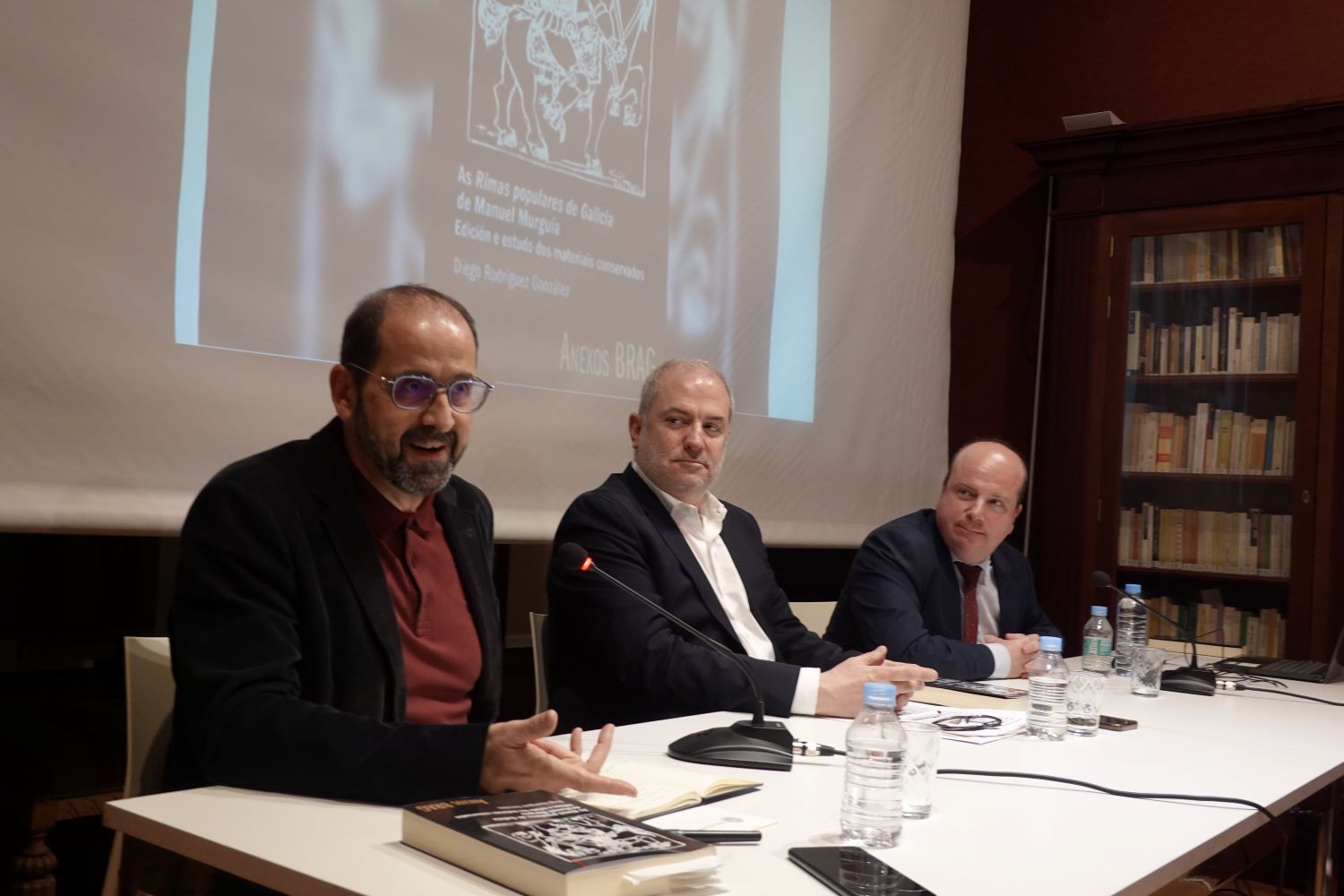 Diego Rodríguez presentando o volume ao seu coidado, acompañado na mesa por Gonzalo Castro e Henrique Monteagudo.