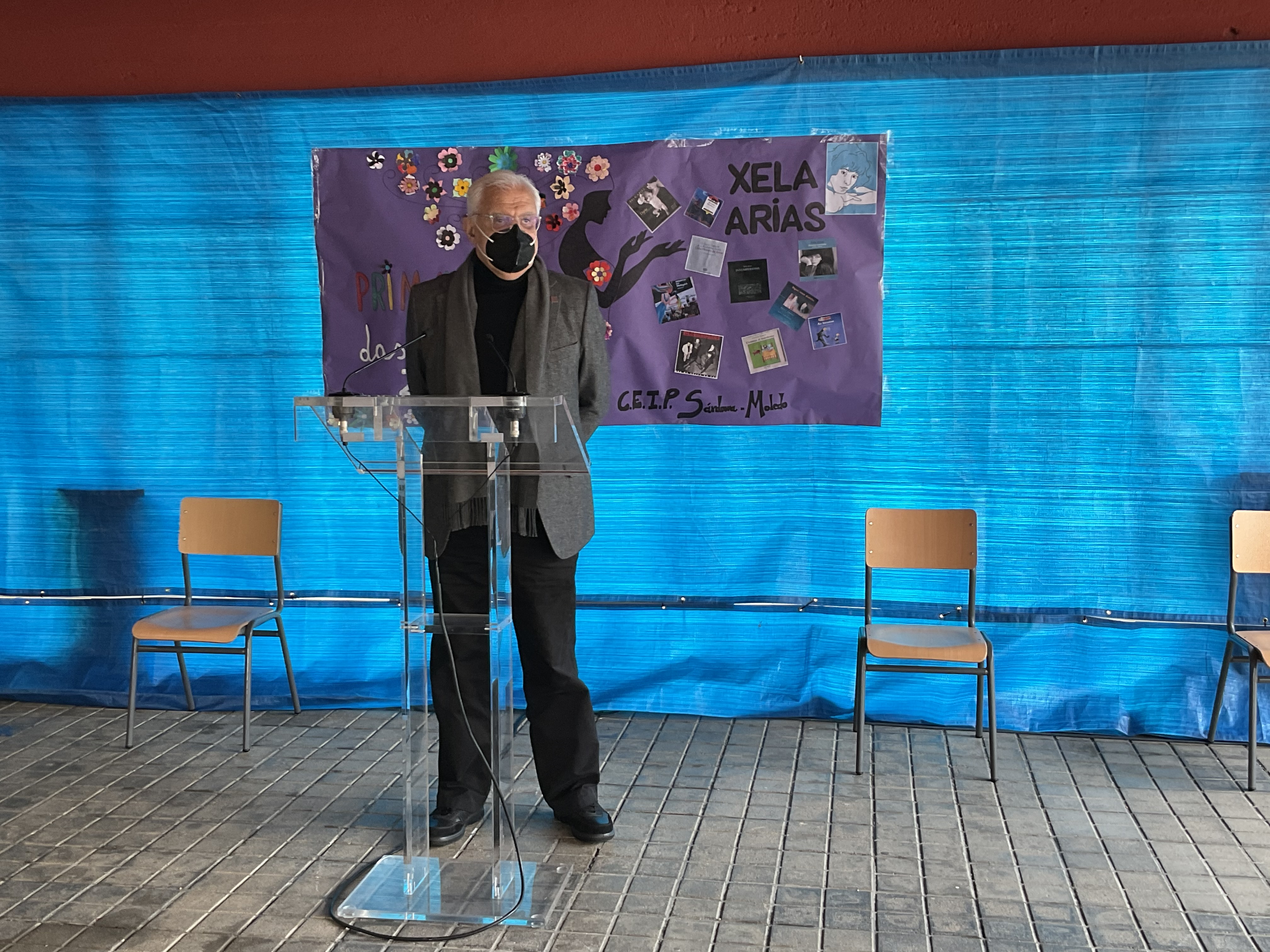 Os catro de diante son alumnas e alumnos do CEIP, Xela Álvarez Fernández e Comba Moo Rodríguez, as dúas fixeron de Xela en distintos momentos da vida; e Carlos Xavier Aguilera Pacheco e Gabriel Rodríguez Soto. Detrás, pola esquerda, Víctor F. Freixanes, presidente da RAG, Xoán Arias Castaño, Amparo Castaño (nai de Xela Arias), Fina Casalderrey (académica), Darío Gil Arias (fillo de Xela Arias), Marcos e Lois Arias Castaño (irmáns de Xela Arias) e a directora do CEIP Sárdoma-Moledo, Pilar Vila Nieto.