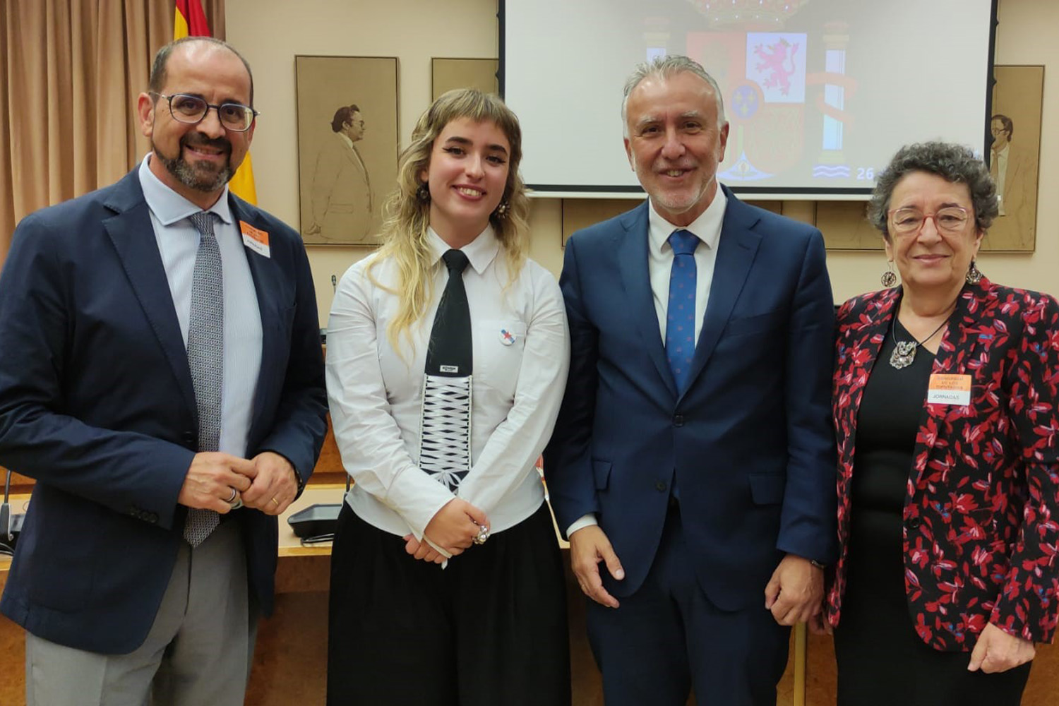Pola esquerda, a alcaldesa da Coruña Inés Rey; a tesoureira da RAG, María López-Sández; o secretario de Estado, Arcadi España; e a arquiveira-bibliotecaria, María Dolores Sánchez Palomino