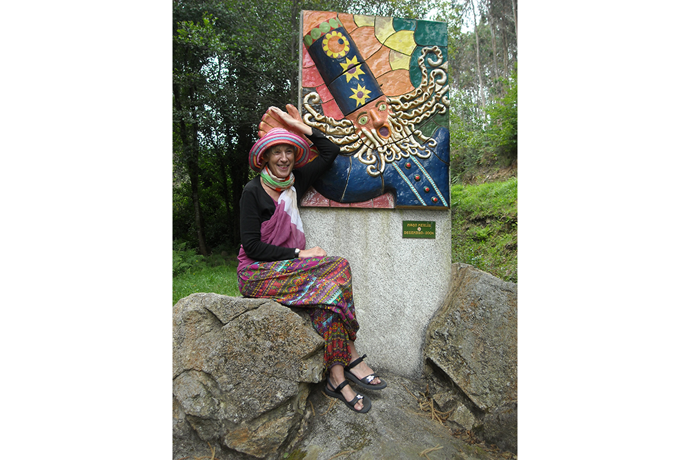 Begoña Caamaño posa ante a escultura de Merlín en Esmelle.