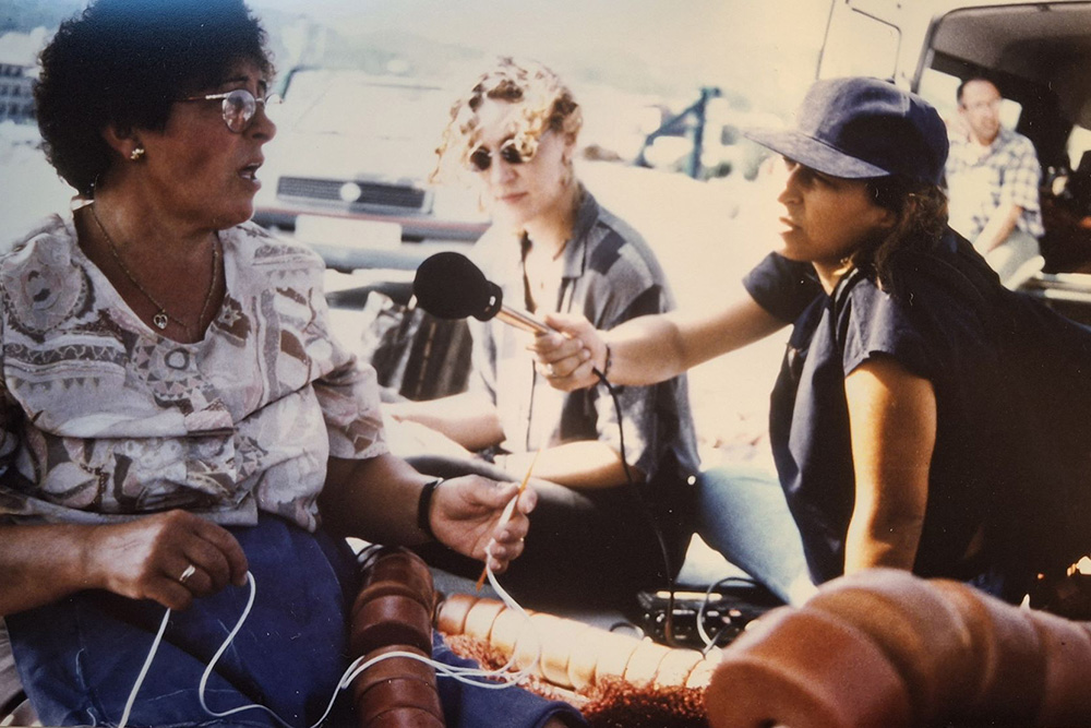 Begoña Caamaño e Ana Romaní realizando unha entrevista para unha reportaxe sobre mulleres e mar para Tempos Novos (1997).