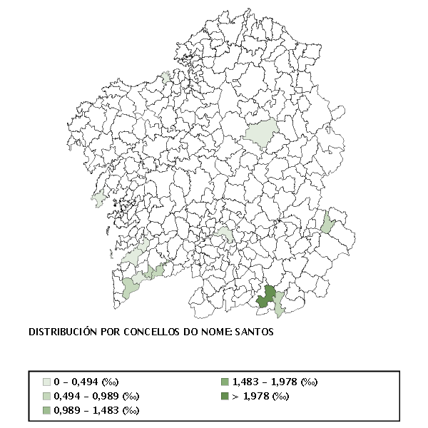 Plural de Santo, do latín Sanctus, participio do verbo sancio, termo da linguaxe relixiosa e política que significa 'facer sagrado ou inviolable, establecer solemnemente', e de aí, 'ratificar, sancionar'. Coa chegada do cristianismo sanctus pasa de 'consagrado a Deus, venerable' a 'home que pola súa perfección participa de certas prerrogativas divinas e que algunhas igrexas cristiás elevan ao culto dos altares', isto é, 'santo'. Curiosamente este nome funciona como singular, aínda que o seu significado alude á colectividade dos santos anónimos. É un nome que tamén corre como apelido.