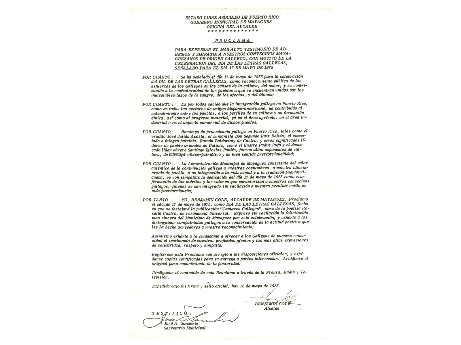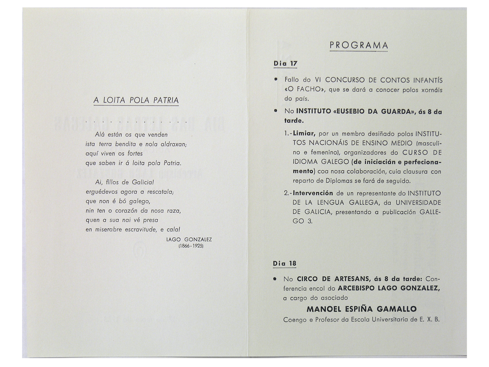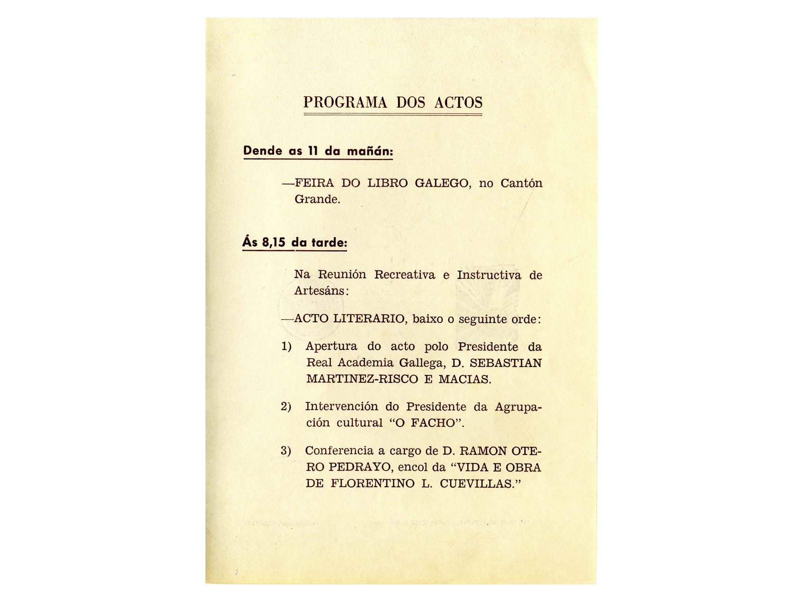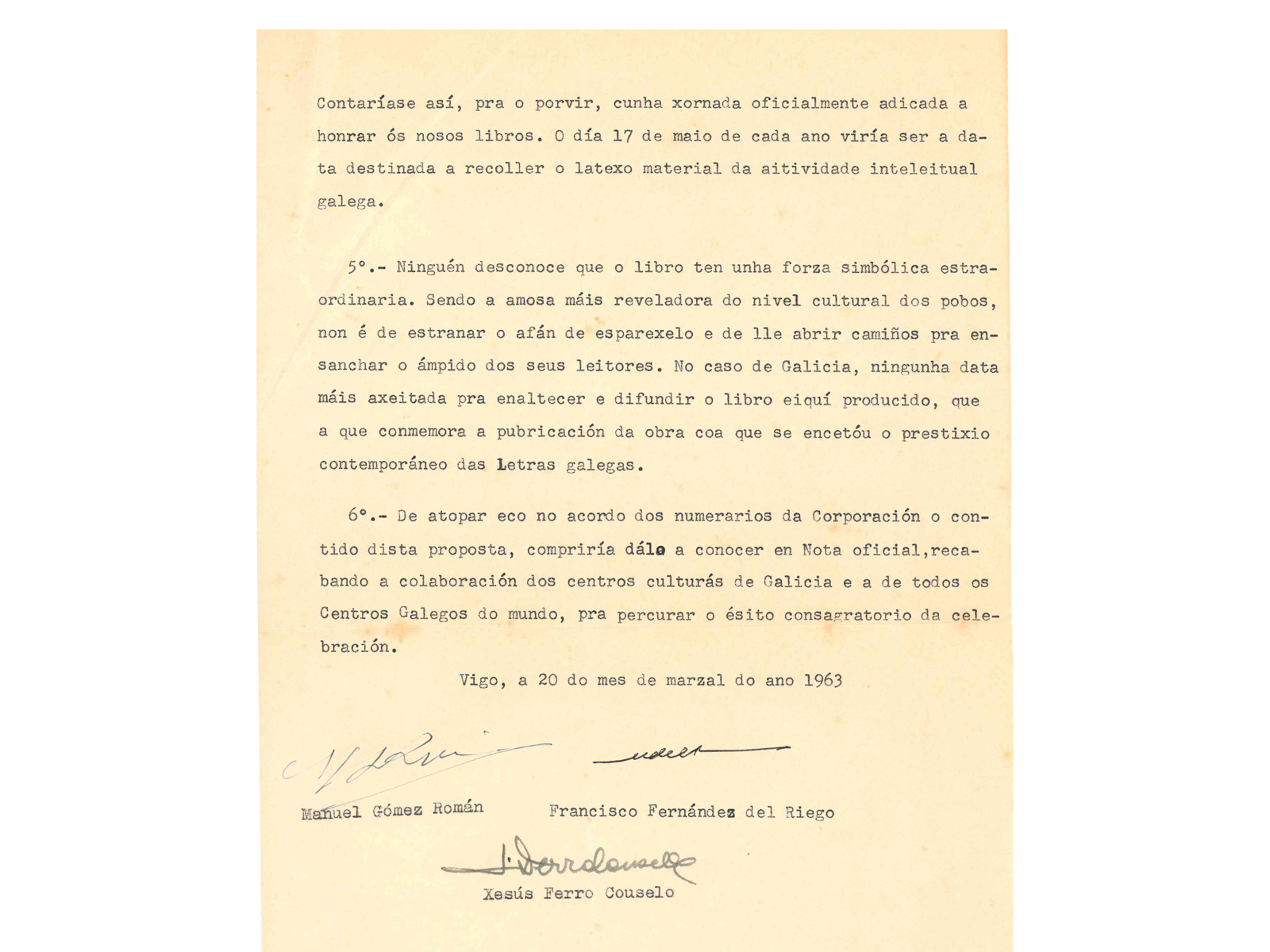 O 20 do mes de marzal do ano 1963, tal como indica o documento que inaugura esta galería, os académicos Manuel Gómez Román, Xesús Ferro Couselo e Francisco Fernández del Riego propoñen no plenario da Real Academia Galega a celebración dun día grande dedicado ao libro e á lingua galega, unha xornada festiva e reivindicativa a prol da cultura e a identidade de Galicia centrada sobre todo no prestixio do idioma. O libro era entón o principal símbolo dese prestixio. A data escollida, o 17 de maio, tiña unha significación especial: facíanse daquela cen anos da primeira edición de Cantares Gallegos, título fundacional do noso Rexurdimento.