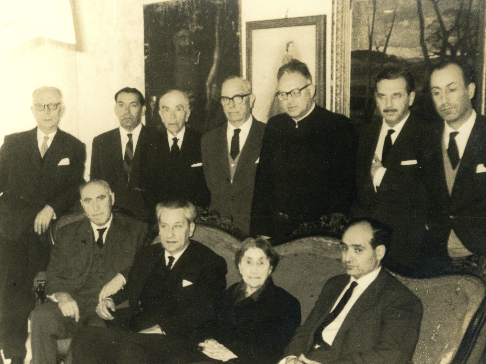 1963 Rosalía de Castro. Visita a Gala Murguía de Castro na súa casa da rúa de Santo Agostiño na Coruña. De esquerda a dereita, Vales Villamarín, Juan Naya, Joaquín Freyre de Andrade, Julio Rodríguez Yordi, Henrique Chao Espina, Marino Donega e Antonio Meijide Pardo. Sentados: Leandro Carré, Sebastián Martínez-Risco, Gala Murguía, Francisco Serrano Castilla