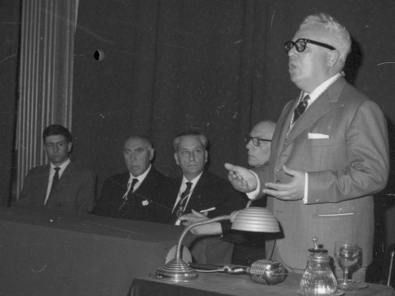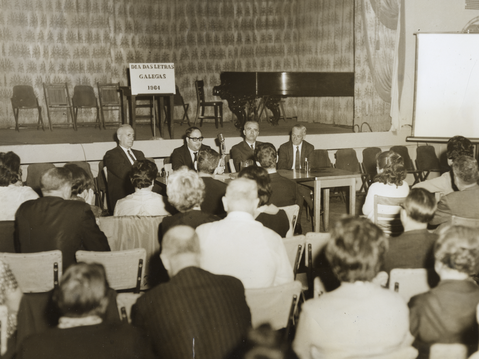 1965 Eduardo Pondal. Francisco Fernández del Riego durante a súa alocución na sesión plenaria da RAG, celebrada nos locais da Reunión Recreativa de Artesáns da Coruña. Sentados, de esquerda a dereita: Henrique Harguindey Banet, presidente da Agrupación Cultural O Facho, Leandro Carré, Sebastián Martínez-Risco e Francisco Vales Villamarín