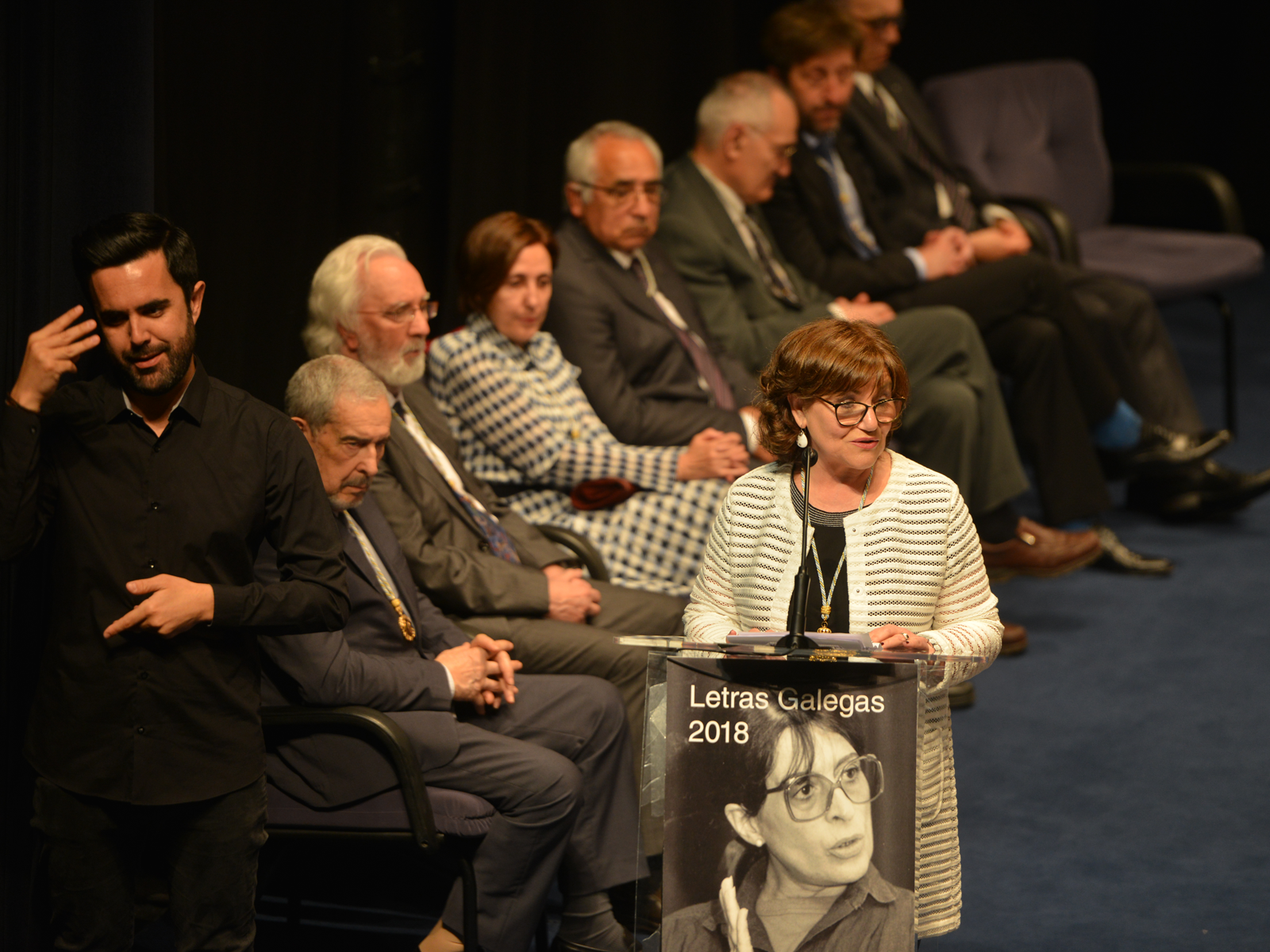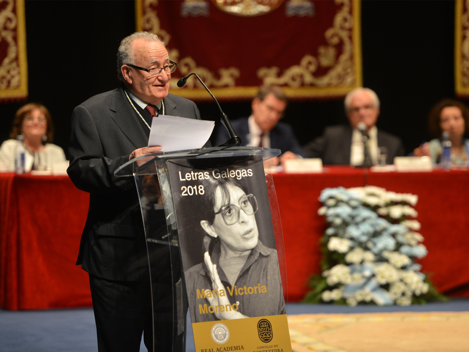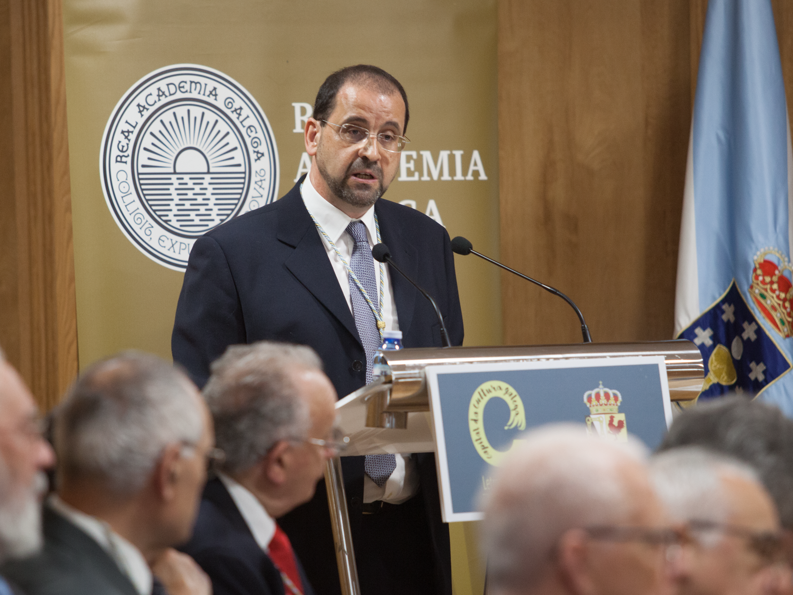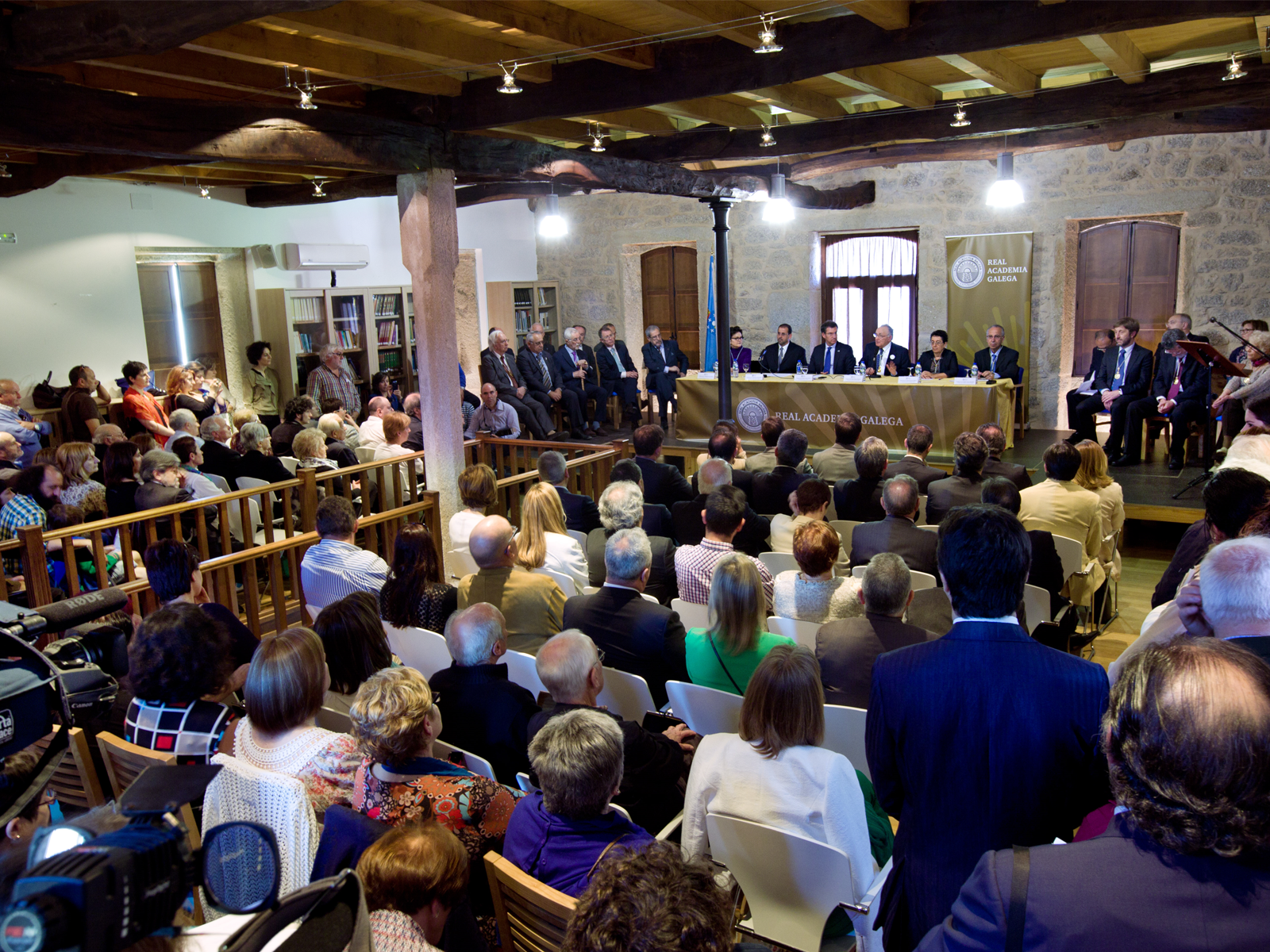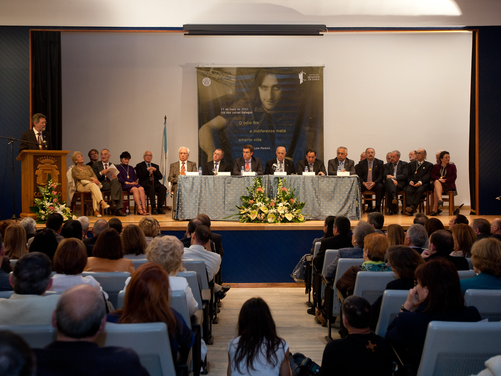 2011 Lois Pereiro. Intervención de Darío Xohán Cabana na Casa da Cultura de Monforte de Lemos durante o plenario extraordinario da Real Academia Galega. De esquerda a dereita sentados: Luz Pozo, Antón Santamarina, Margarita Ledo, Neira Vilas, Manuel Rivas (detrás). Na mesa: Euloxio R. Ruibal, Manuel González, Alberto Núñez Feijoo, Xosé Luís Méndez Ferrín, Xosé Luís Axeitos. Sentados: Francisco Fernández Rei, Ramón Villares, Salvador García-Bodaño, Ramón Lorenzo; detrás: Rosario Álvarez, Xesús Alonso Montero, Andrés Torres Queiruga, Xesús Ferro Ruibal e Víctor F. Freixanes