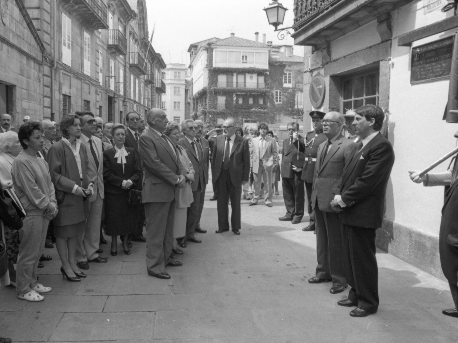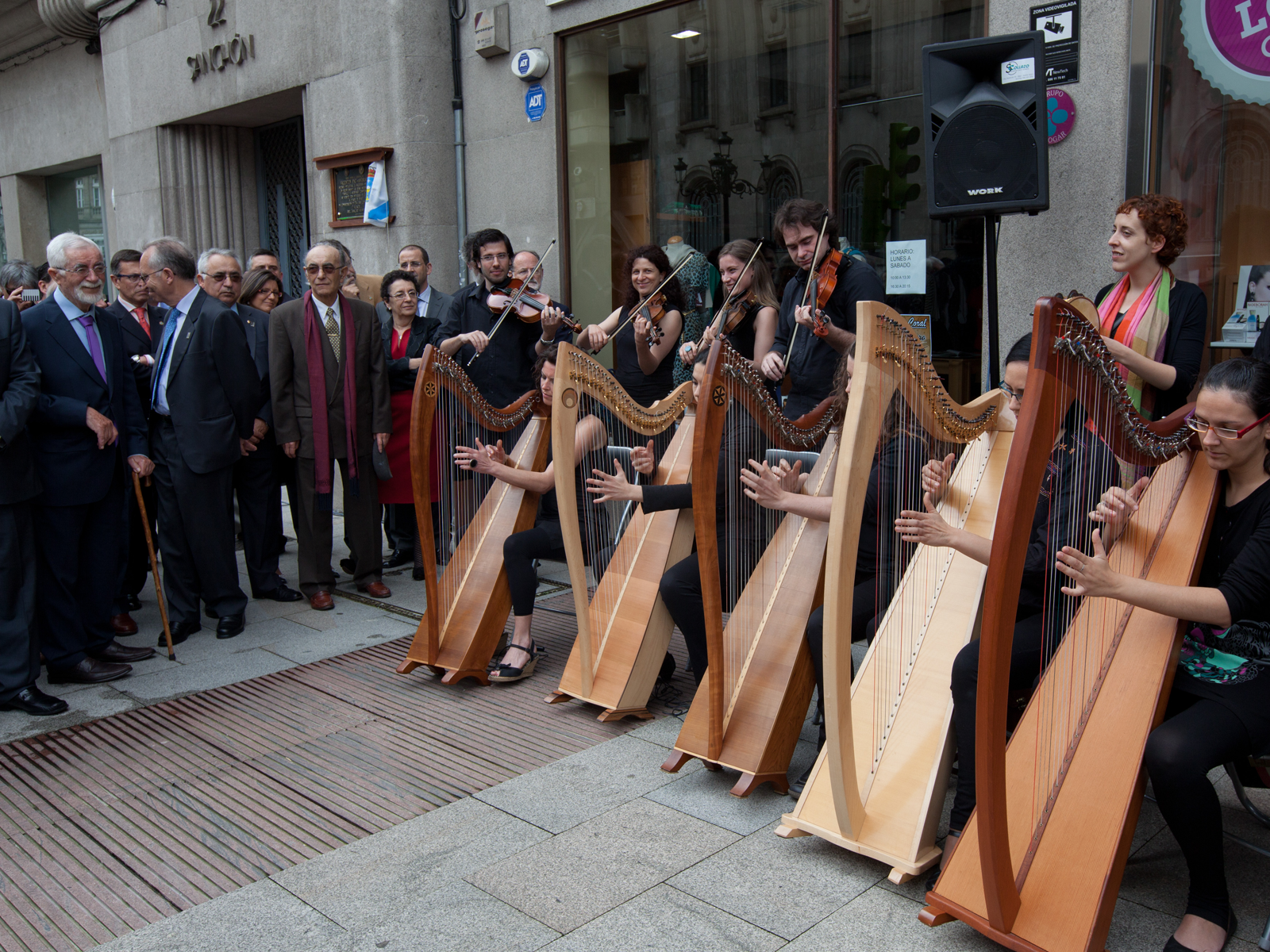 2012 Valentín Paz-Andrade. Descubrimento dunha placa no edificio Sanchón da rúa Policarpo Sanz, onde Paz-Andrade residiu e traballou. Entre o público: Bernardino Graña, Andrés Torres Queiruga, Francisco Fernández Rei, Ramón Lorenzo, Rosario Álvarez, Henrique Monteagudo e Xesús Ferro. Acompañou o acto a música de Son de Seu