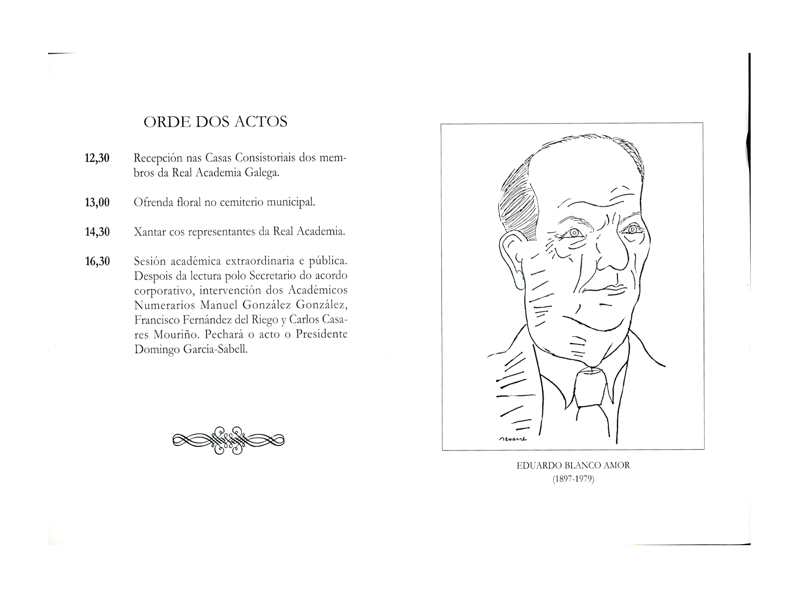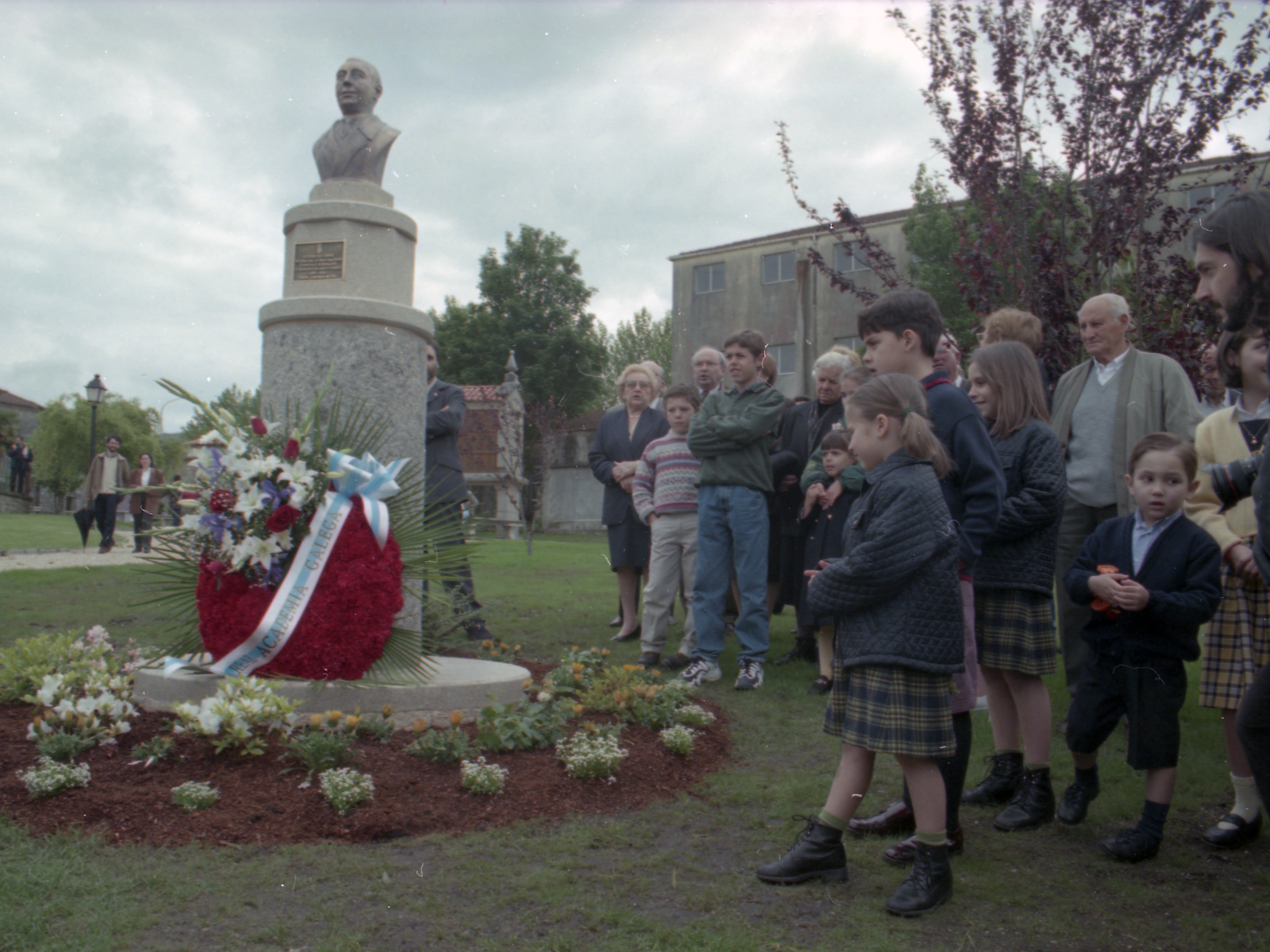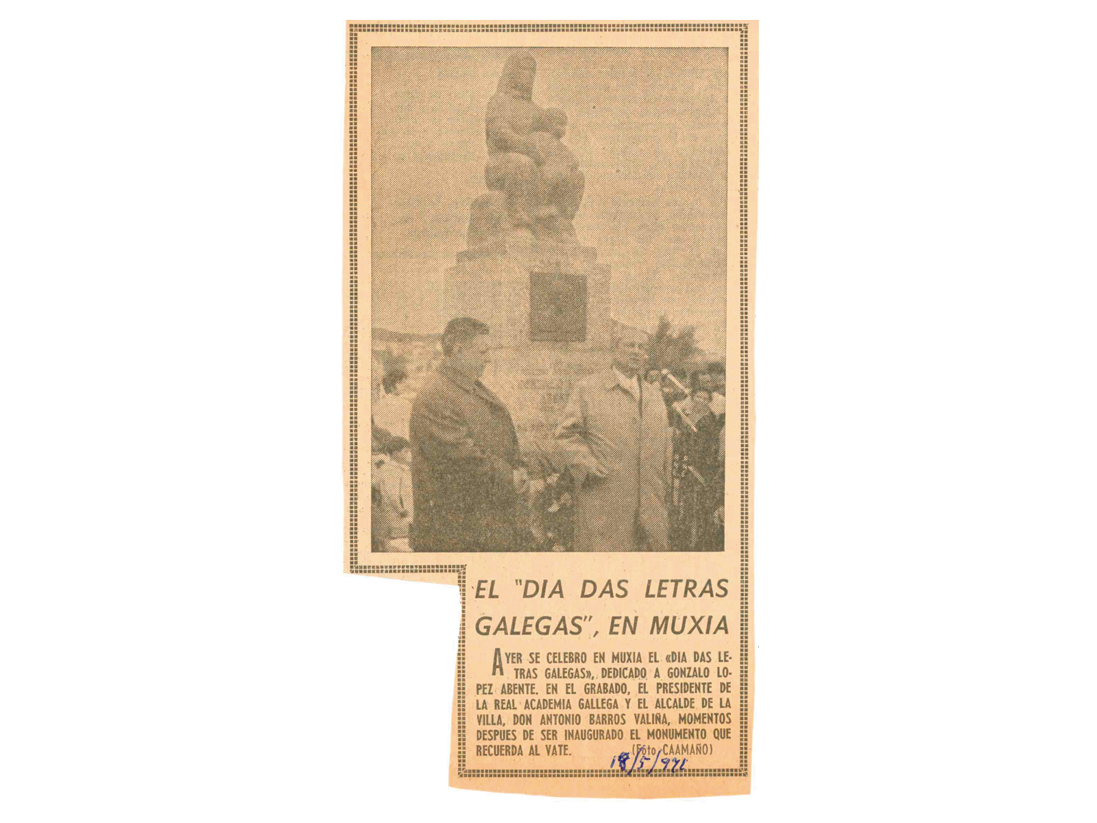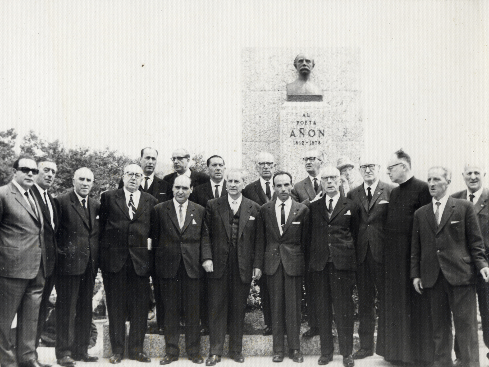 1966 Francisco Añón. Inauguración do monumento en memoria de Francisco Añón, en Outes, o 17 de maio de 1966. Entre os asistentes, na primeira fila, Leandro Carré, Ramón Otero Pedrayo, Francisco Serrano Castilla, Sebastián Martínez-Risco, Puerta Henche (alcalde de Outes), Francisco Vales Villamarín, Fermín Bouza-Brey, Enrique Chao Espina. Detrás, entre outros, Antonio Meijide Pardo, Juan Naya, Julio Rodríguez Yordi e José Luís Bugallal