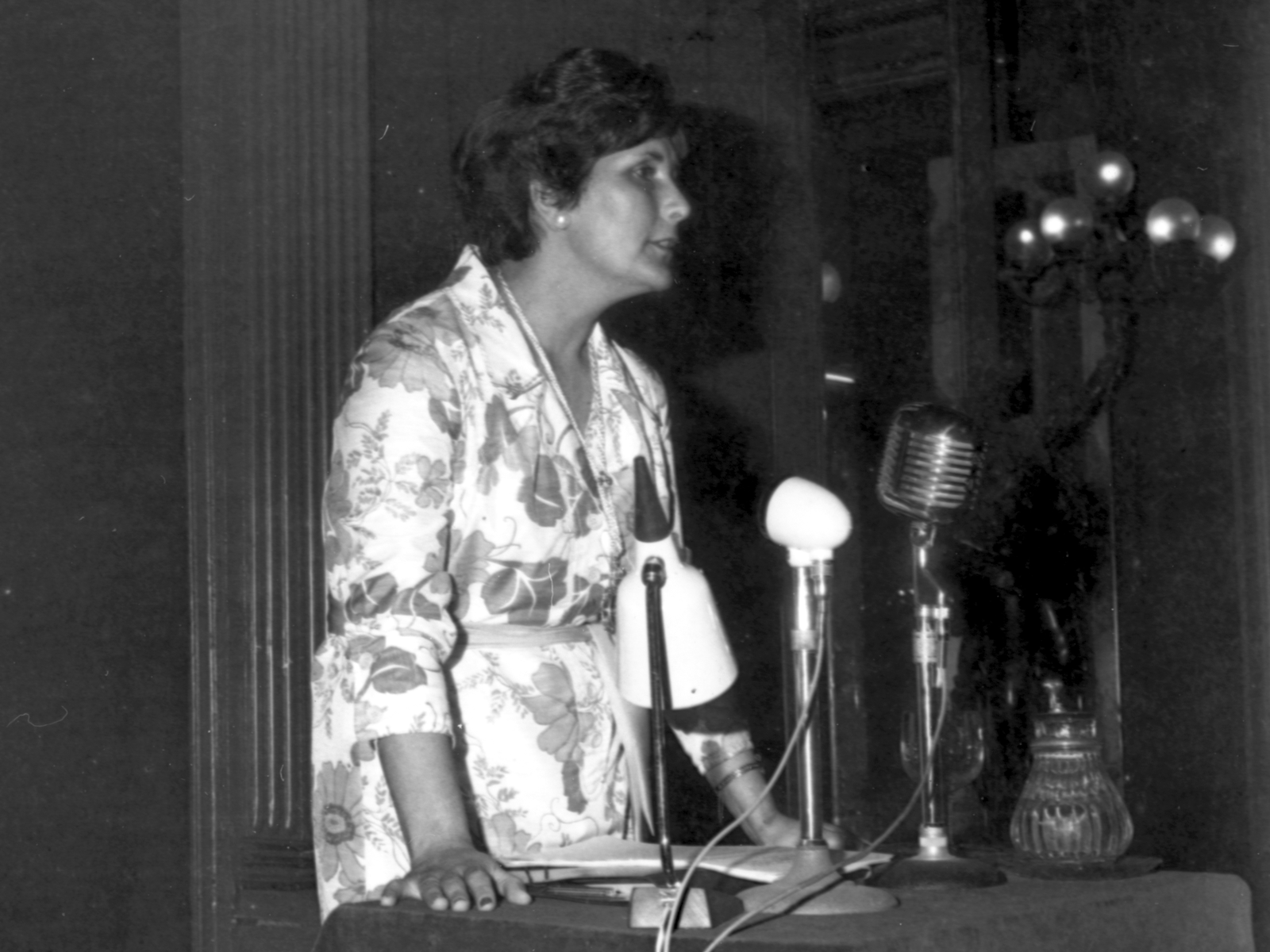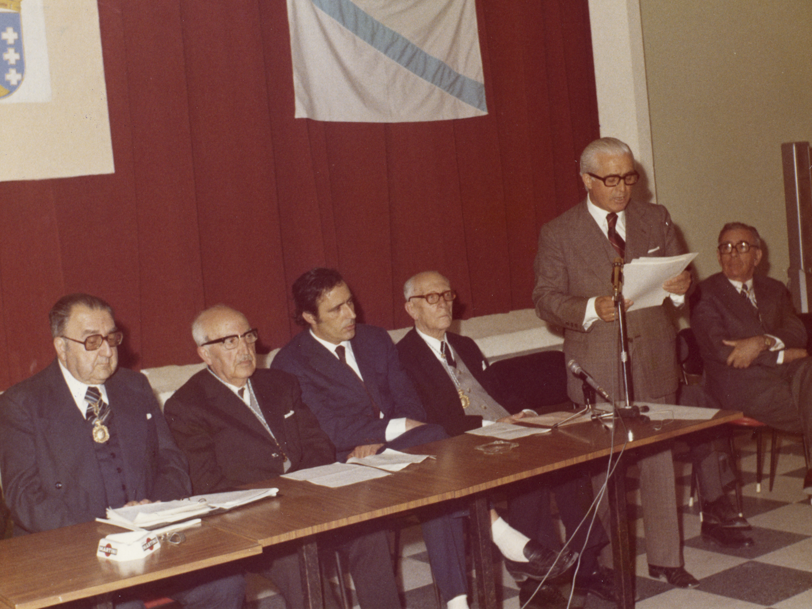 1976 Ramón Cabanillas. Sesión académica extraordinaria da RAG celebrada no salón nobre da Sociedade Cultural de Cambados. De esquerda a dereita, Xosé Filgueira Valverde, Antonio Fraguas, o alcalde de Cambados (Benito González Ambrós?) e Francisco Vales Villamarín. De pé, Xulio F. Ogando le a súa alocución. Á dereita del, Ramón Martínez López