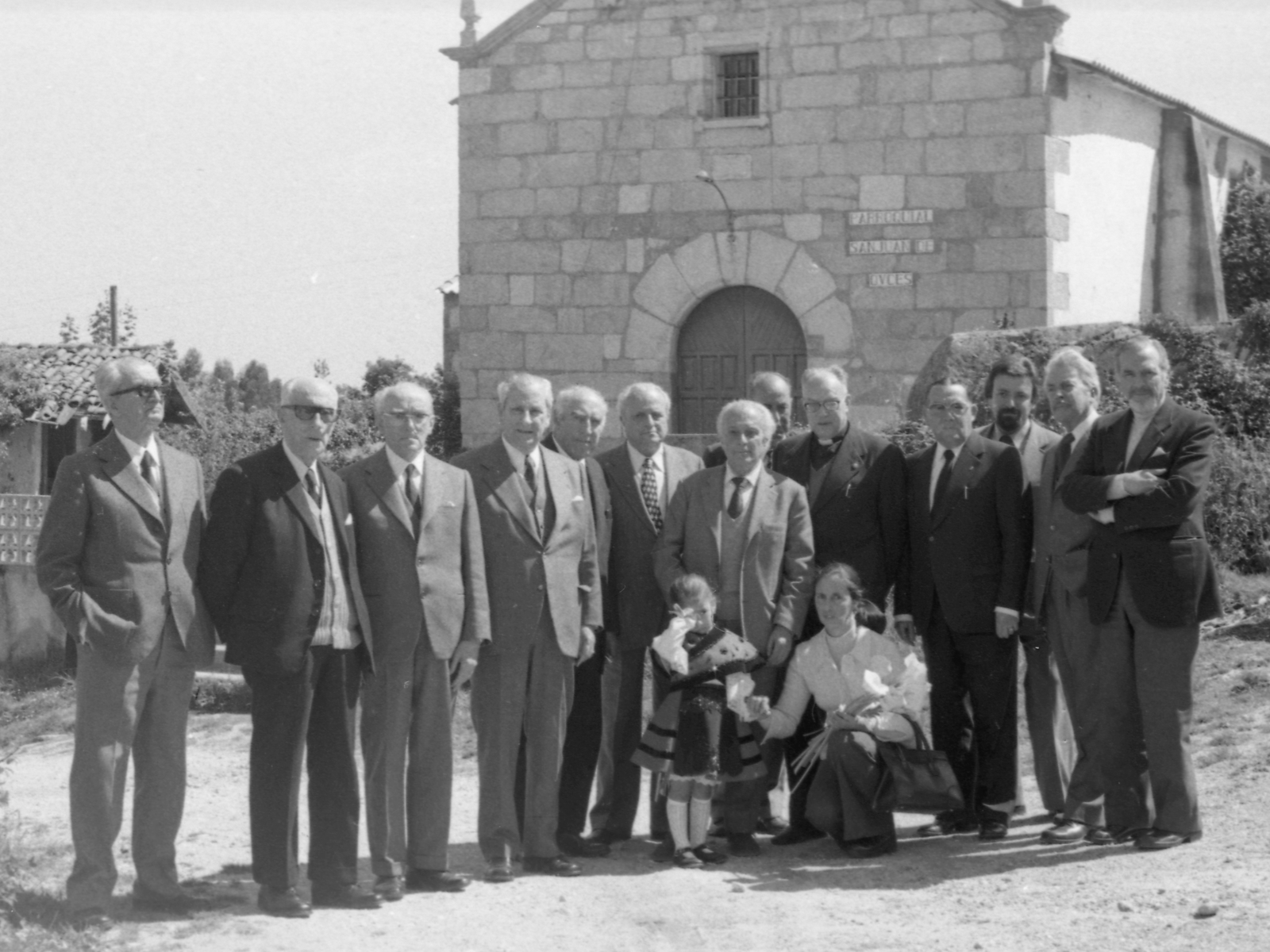 1974 Xoán Vicente Viqueira. Ofrenda floral ante a tumba de Xoán Vicente Viqueira, en San Xoán de Ouces (Bergondo). De esquerda a dereita, entre outros, José Luís Bugallal, Francisco Vales Villamarín, Isidro Parga Pondal, Sebastián Martínez-Risco, Leandro Carré, Antonio Meijide Pardo, Enrique Chao Espina, Juan Naya, Rafael Dieste e Marino Dónega