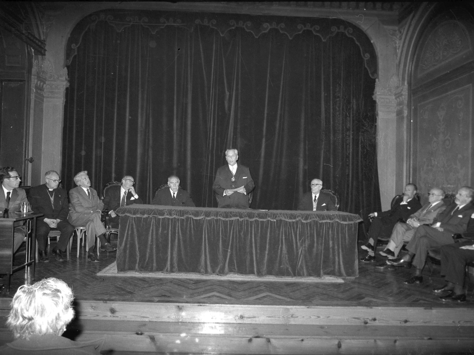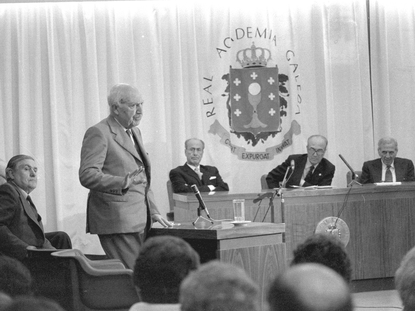 1974 Xoán Vicente Viqueira. Sesión Plenaria extraordinaria da Real Academia Galega celebrada no paraninfo do Instituto Eusebio da Garda, da Coruña. De esquerda a dereita, Ramón Piñeiro, Enrique Chao Espina, Rafael Dieste, Domingo García-Sabell, Leandro Carré, Sebastián Martínez-Risco (de pé, abre a sesión), Francisco Vales Villamarín, Antonio Meijide Pardo, Isidro Parga Pondal, Marino Dónega e José Luís Bugallal