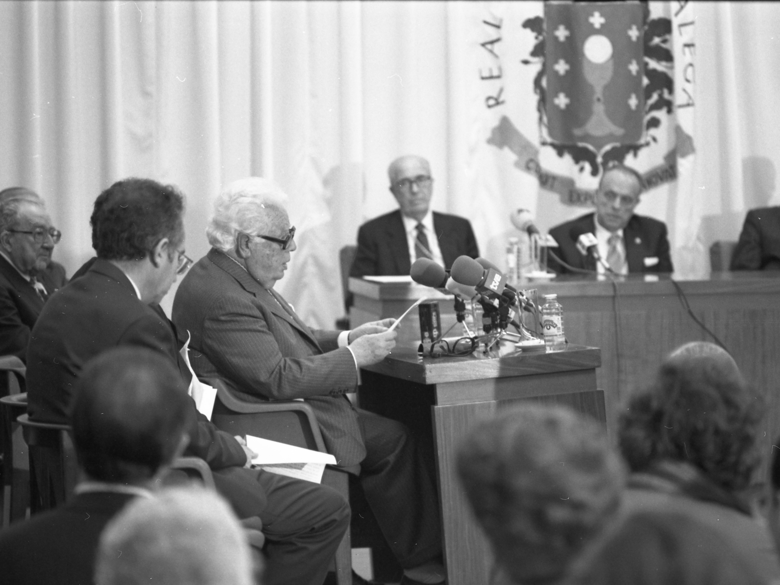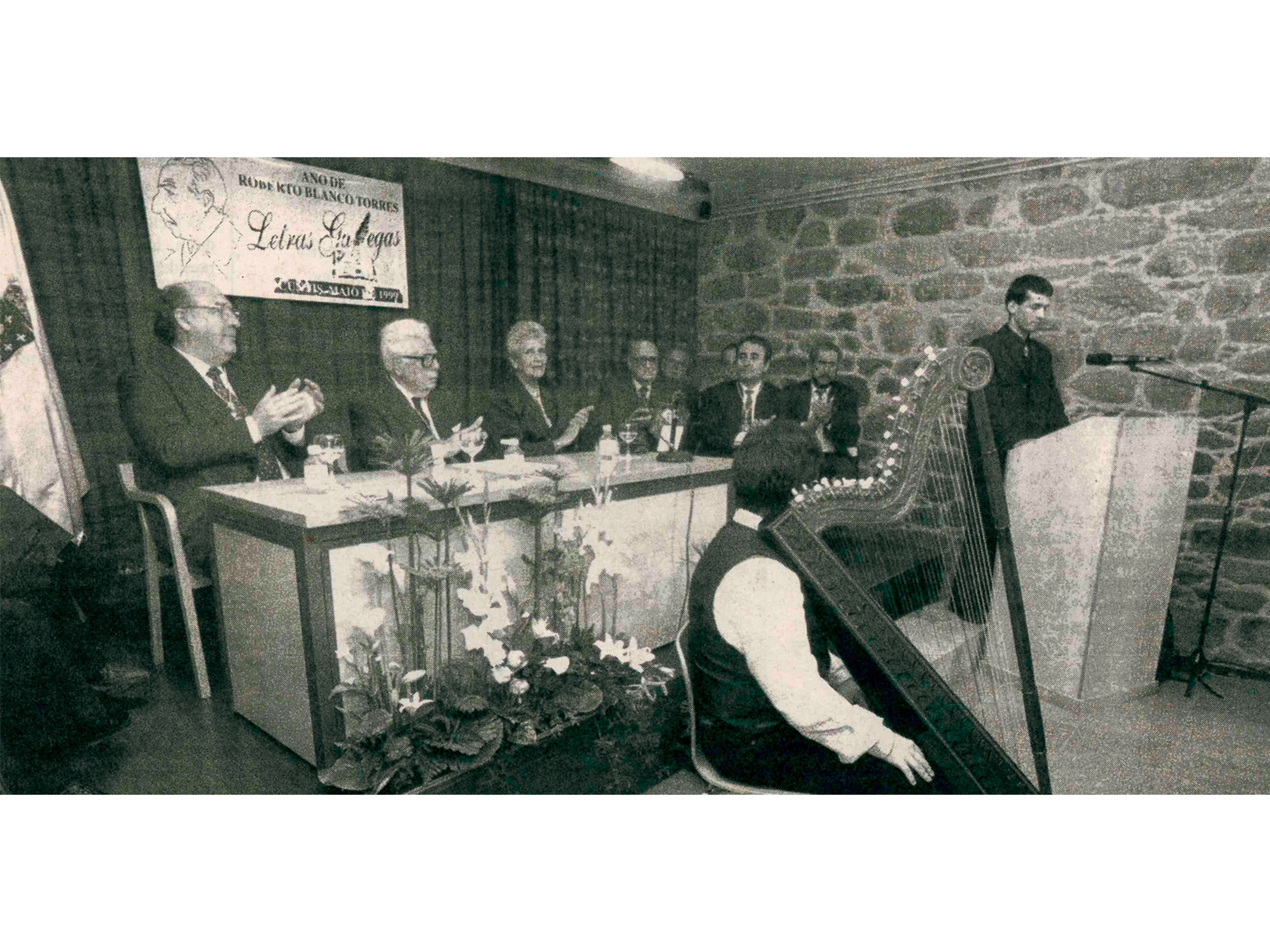 1999 Roberto Blanco Torres. Fotografía en prensa do plenario extraordinario da Real Academia Galega. Na imaxe, Xosé Ramón Barreiro, Francisco Fernández del Riego, Luz Pozo Garza, Antonio Gil Merino, Carlos Casares e Salvador García-Bodaño aplauden a intervención de Manuel Vázquez, Manoele, que recitou versos acompañado dun músico de arpa