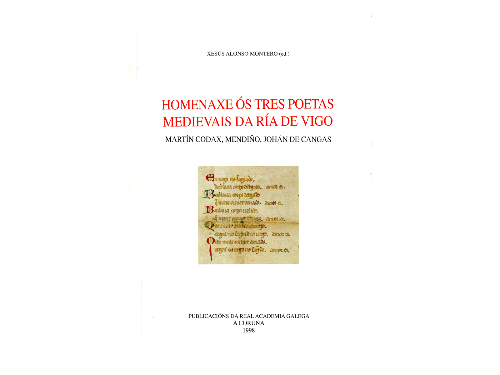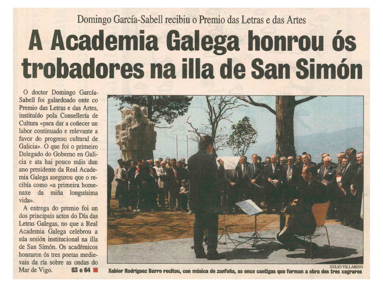 1998 Trobadores da ría de Vigo. Recorte de prensa que recolle a noticia da celebración do plenario extraordinario da RAG na illa de San Simón. Na imaxe Xabier Rodríguez Barro recita as once cantigas dos tres trobadores, acompañado dun zanfonista. No fondo á esquerda, o monumento aos trobadores, de Ferreiro Badía, inaugurado na mesma xornada