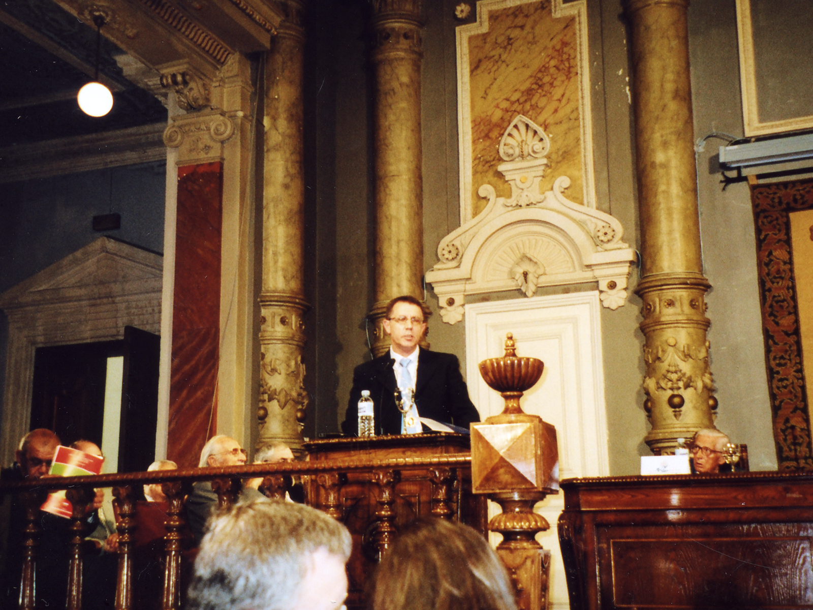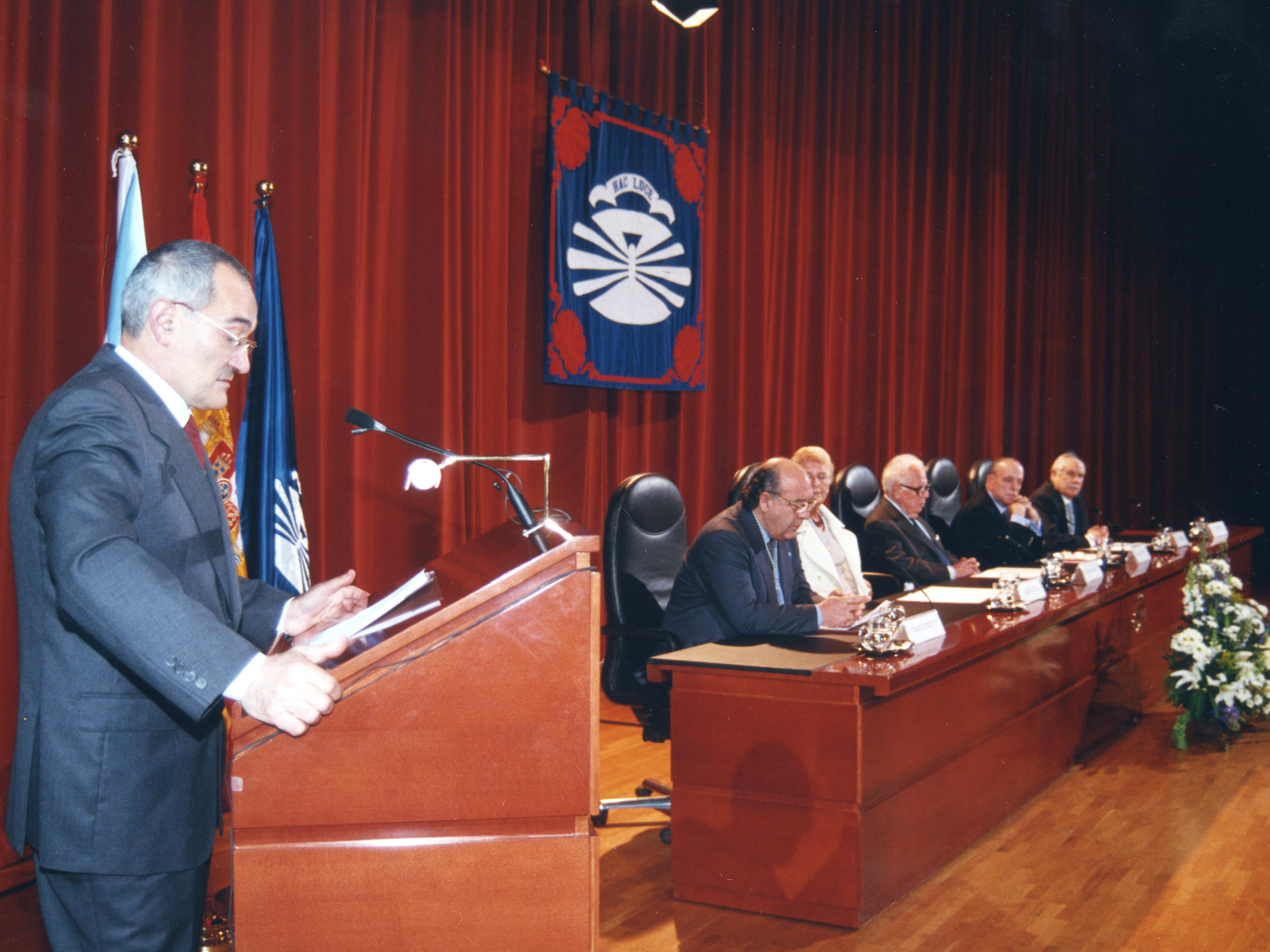 2000 Manuel Murguía. Intervención de Antón Santamarina no plenario extraordinario da Real Academia Galega celebrado no paraninfo da Universidade da Coruña. Na mesa presidencial, Xosé Ramón Barreiro, Luz Pozo, o presidente da Academia, Francisco Fernández del Riego, o presidente da Xunta de Galicia e Constantino García