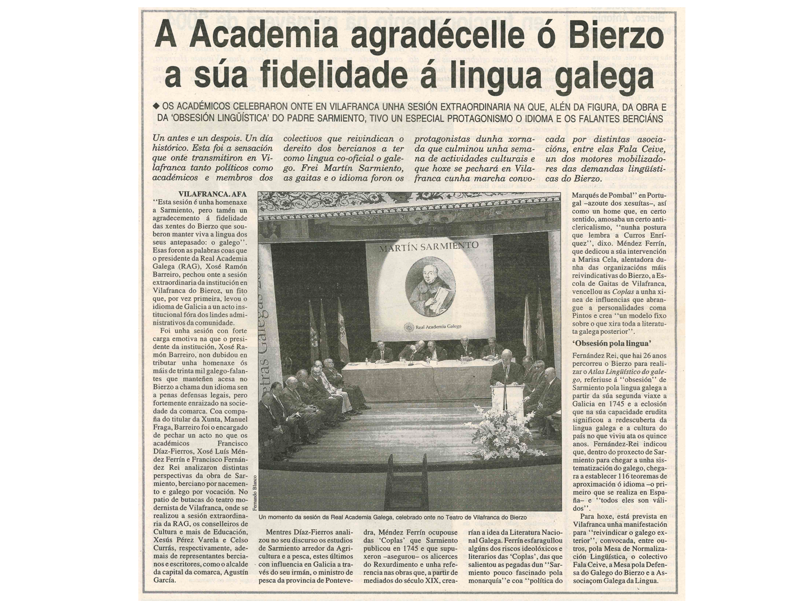 2001 Eladio Rodríguez González. Recorte de prensa. Fotografía da alocución de Xesús Alonso Montero durante a sesión plenaria extraordinaria da Real Academia Galega celebrada no mosteiro de san Clodio. Detrás, na mesa presidencial, Xosé Ramón Barreiro, Xesús Pérez Varela, Francisco Fernández del Riego, Constantino García e Antonio Gil Merino