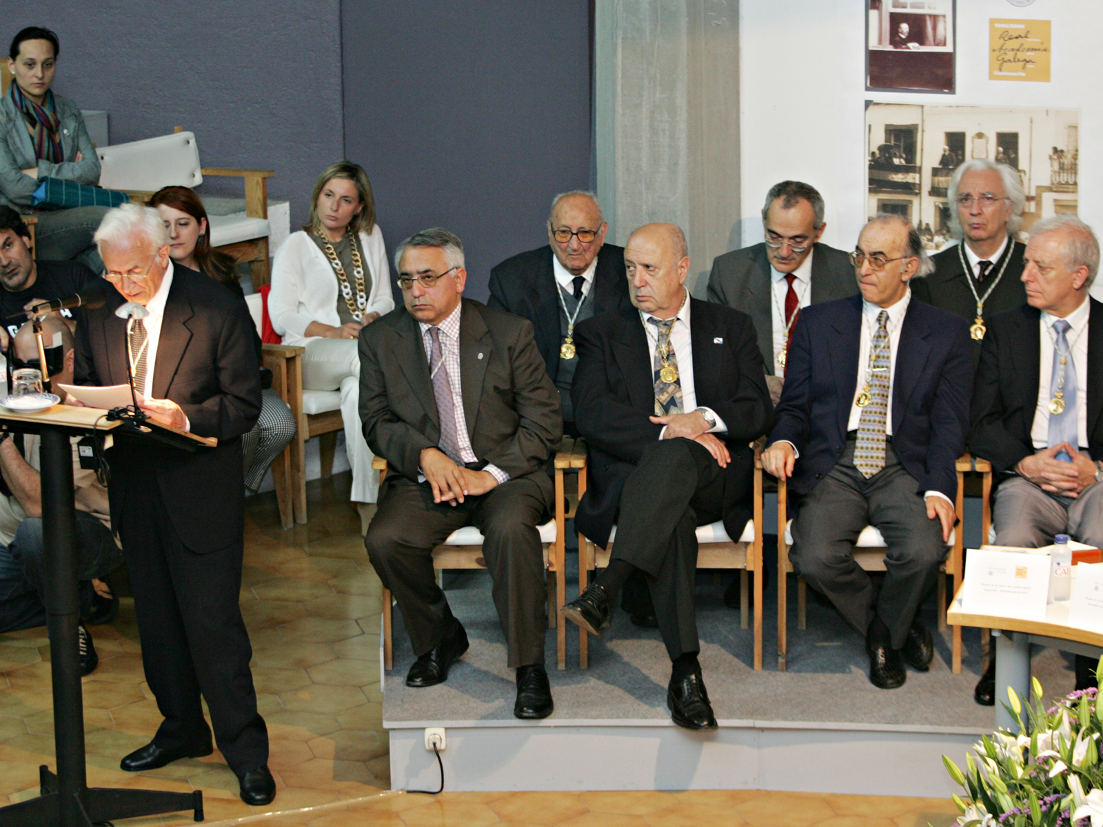 2006 Manuel Lugrís Freire. Intervención de Xosé Neira Vilas na sesión extraordinaria da Real Academia Galega no auditorio do Museo Carlos Maside, O Castro de Samoedo (Sada). Sentados (diante): Francisco Fernández Rei, Xosé Luís Méndez Ferrín, Ramón Lorenzo Vázquez, Francisco Díaz-Fierros. Detrás: Antonio Gil Merino, Antón Santamarina e Euloxio R. Ruibal
