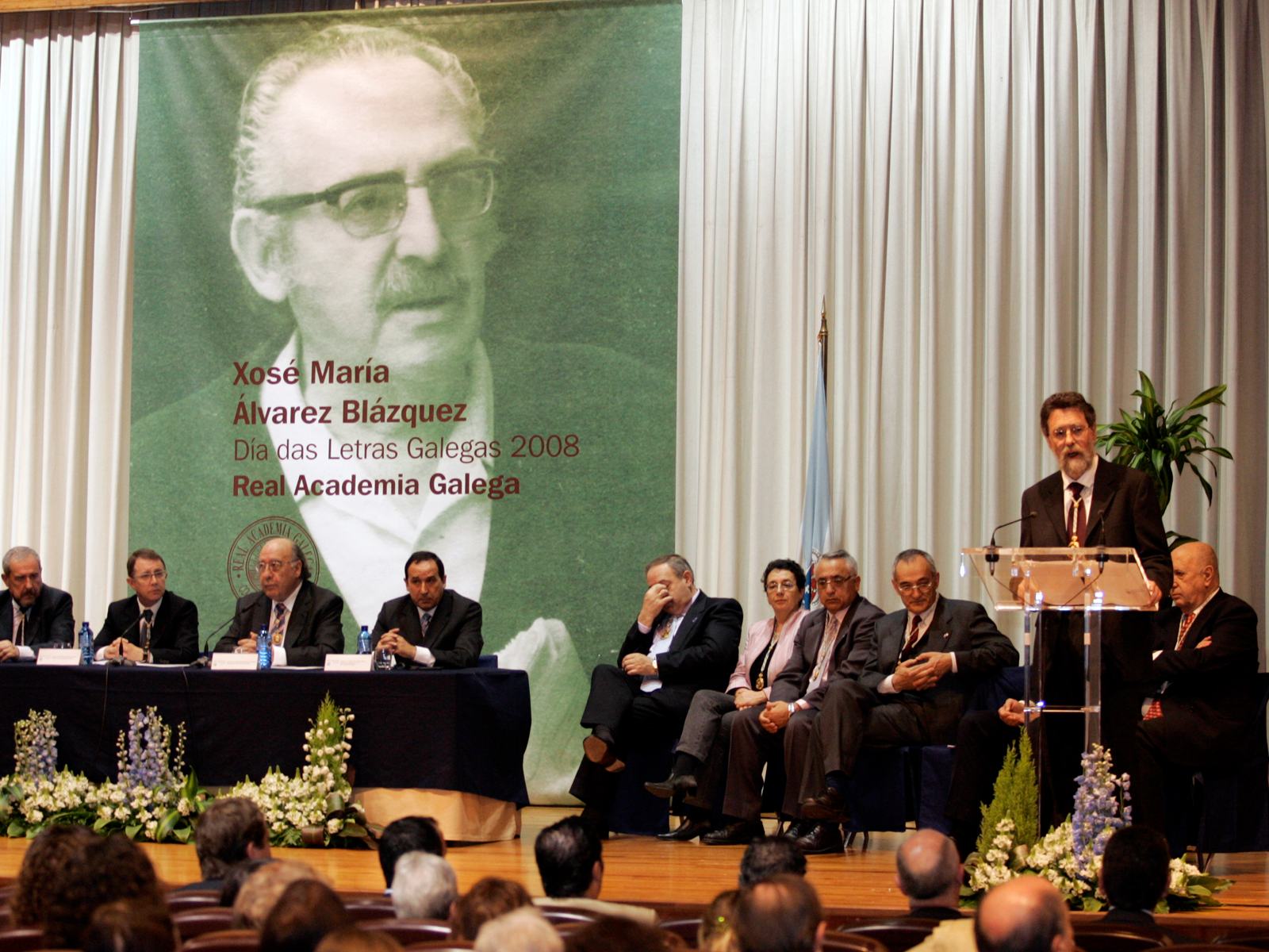 2008 Xosé María Álvarez Blázquez. Darío Xohán Cabana intervén na sesión plenaria extraordinaria e pública da Real Academia Galega celebrada no Auditorio do Concello de Vigo. Na mesa presidencial de esquerda a dereita: Manuel González, Xosé Ramón Barreiro e Xosé Luís Axeitos. Sentados: Ramón Villares, Rosario Álvarez, Francisco Fernández Rei, Antón Santamarina e Xosé Luís Méndez Ferrín