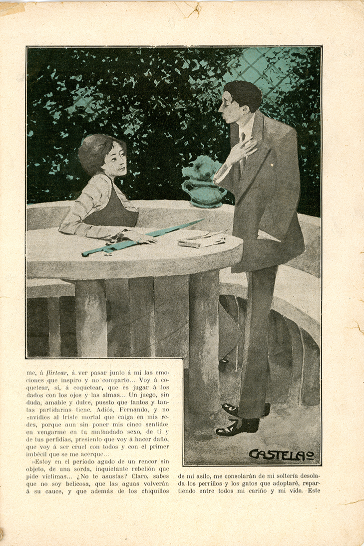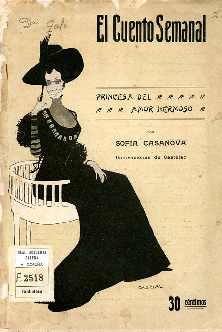 Un bo exemplo disto último son as ilustracións a dúas tintas da novela de Sofía Casanova Princesa del amor hermoso, publicada en 1909 na revista literaria El Cuento Semanal de Madrid. Conforman unha colección de estampas que se adaptan á estética e á técnica modernista imperantes neses primeiros anos do século XX, mais nas que Castelao demostra xa a súa habelencia, adquirida de maneira autodidacta. Destaca tamén nesta colección a ausencia de toda crítica ou alusión a problemáticas de índole social, en oposición ao que sería a norma ao longo da súa traxectoria artística.