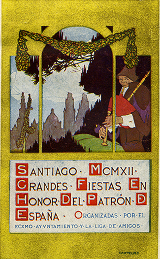 Outro exemplo de costumismo presente na súa obra, elaborado mediante receitas modernistas, achámolo no programa das Festas do Apóstolo de 1912, onde representa unha escena dividida en tres panos, semellante aos trípticos medievais. No fondo aparece esbozada a catedral de Santiago, e en primeiro plano atopamos un gaiteiro, mesturando relixiosidade e festividade.