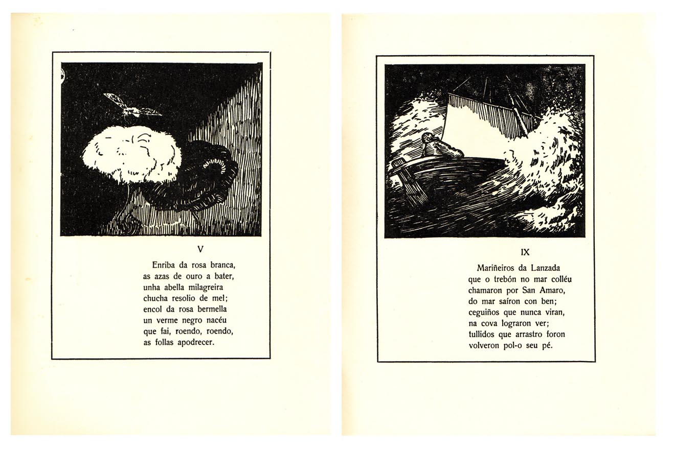 O deseño das cubertas de libros que fai Castelao neses anos non escapa desta busca da simplicidade. Boa mostra son as de dous libros de Ramón Cabanillas: O bendito San Amaro e Na noite estrelecida. Con estas dúas obras o poeta do Salnés pretendeu dotar a Galicia dunha mitoloxía que servise á causa galeguista, para o que recupera o legado medieval, os mitos artúricos e a mística cristiá, reinterpretados en clave galega, nun discurso profético que auspiciaba un glorioso porvir para os galegos.